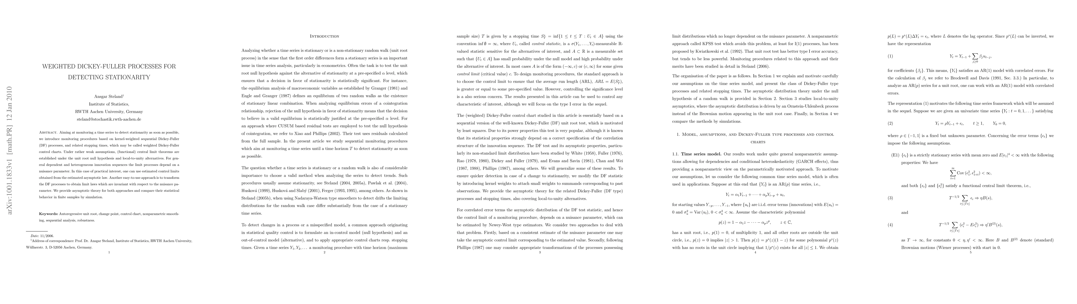 Aiming at monitoring a time series to detect stationarity as soon as possible, we introduce monitoring procedures based on kernel-weighted sequential Dickey-Fuller (DF) processes, and related stopping times, which may be called weighted Dickey-Fuller control charts. Under rather weak assumptions, (functional) central limit theorems are established under the unit root null hypothesis and local-to-unity alternatives. For gen- eral dependent and heterogeneous innovation sequences the limit processes depend on a nuisance parameter. In this case of practical interest, one can use estimated control limits obtained from the estimated asymptotic law. Another easy-to-use approach is to transform the DF processes to obtain limit laws which are invariant with respect to the nuisance pa- rameter. We provide asymptotic theory for both approaches and compare their statistical behavior in finite samples by simulation.