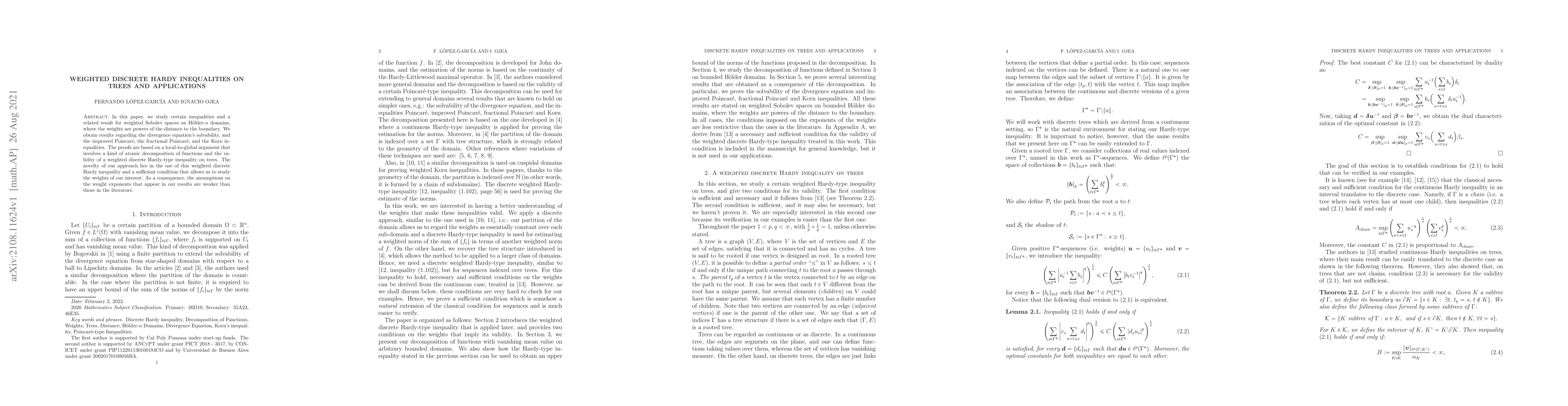 In this paper, we study certain inequalities and a related result for weighted Sobolev spaces on H\"older-$\alpha$ domains, where the weights are powers of the distance to the boundary. We obtain results regarding the divergence equation's solvability, and the improved Poincar\'e, the fractional Poincar\'e, and the Korn inequalities. The proofs are based on a local-to-global argument that involves a kind of atomic decomposition of functions and the validity of a weighted discrete Hardy-type inequality on trees. The novelty of our approach lies in the use of this weighted discrete Hardy inequality and a sufficient condition that allows us to study the weights of our interest. As a consequence, the assumptions on the weight exponents that appear in our results are weaker than those in the literature.