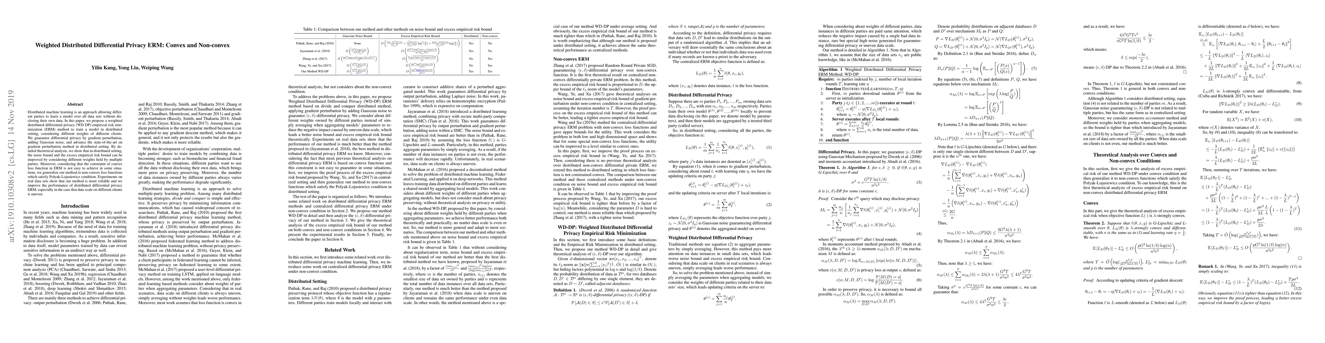 This paper proposes a weighted distributed differential privacy (WD-DP) empirical risk minimization (ERM) method to enhance model training in distributed settings, considering varying client weights. It improves noise bounds and excess empirical risk bounds by incorporating different client weights, and extends its applicability to non-convex loss functions.