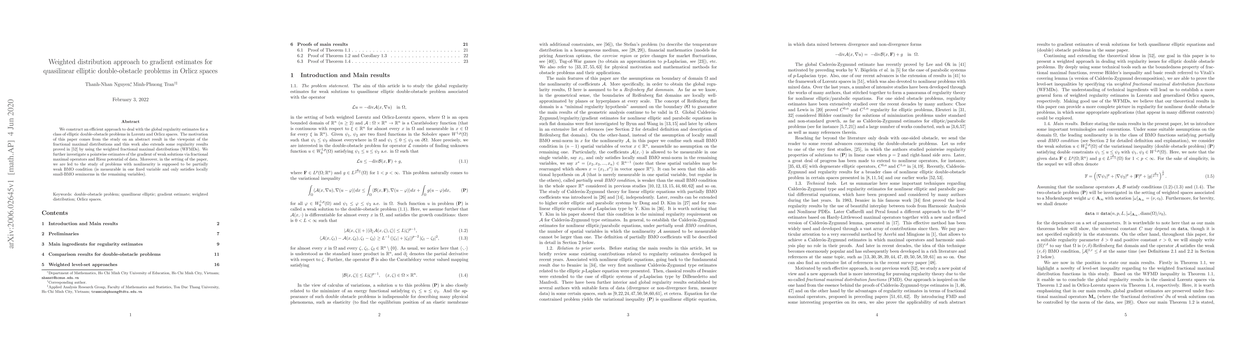 This paper develops a weighted distribution approach to obtain global regularity estimates for quasilinear elliptic double-obstacle problems in Orlicz spaces, extending previous results using weighted fractional maximal distributions. It also provides pointwise gradient estimates for weak solutions via fractional maximal operators and Riesz potential.
