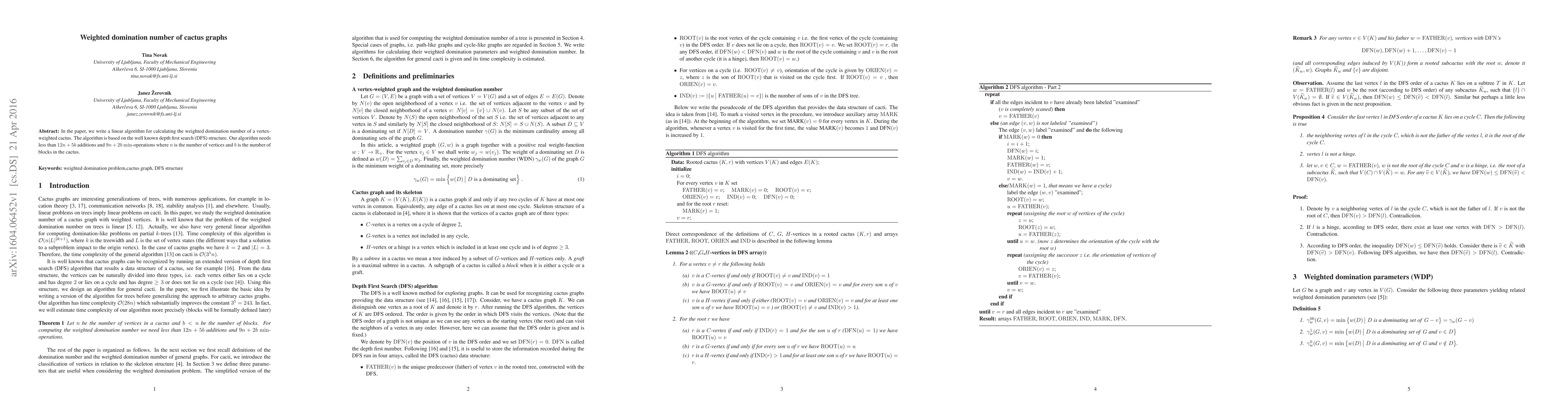 In the paper, we write a linear algorithm for calculating the weighted domination number of a vertex-weighted cactus. The algorithm is based on the well known depth first search (DFS) structure. Our algorithm needs less than $12n+5b$ additions and $9n+2b$ $\min$-operations where $n$ is the number of vertices and $b$ is the number of blocks in the cactus.