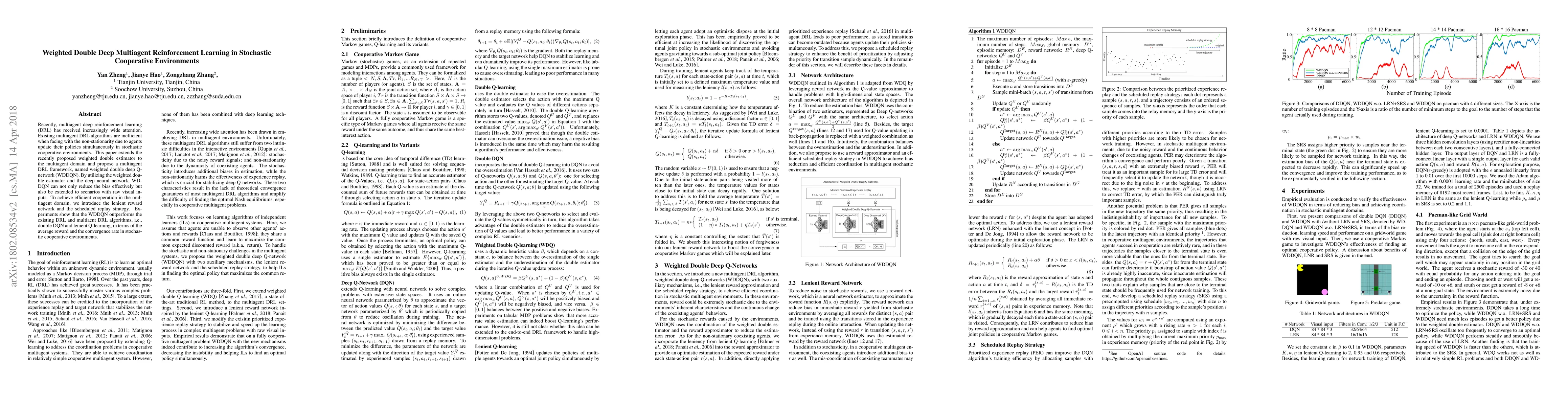 This paper proposes a weighted double deep Q-network (WDDQN) for multiagent reinforcement learning in stochastic cooperative environments, utilizing a weighted double estimator to reduce bias and a scheduled replay strategy for efficient cooperation. Experiments demonstrate WDDQN's superior performance over existing algorithms in terms of reward and convergence rate.