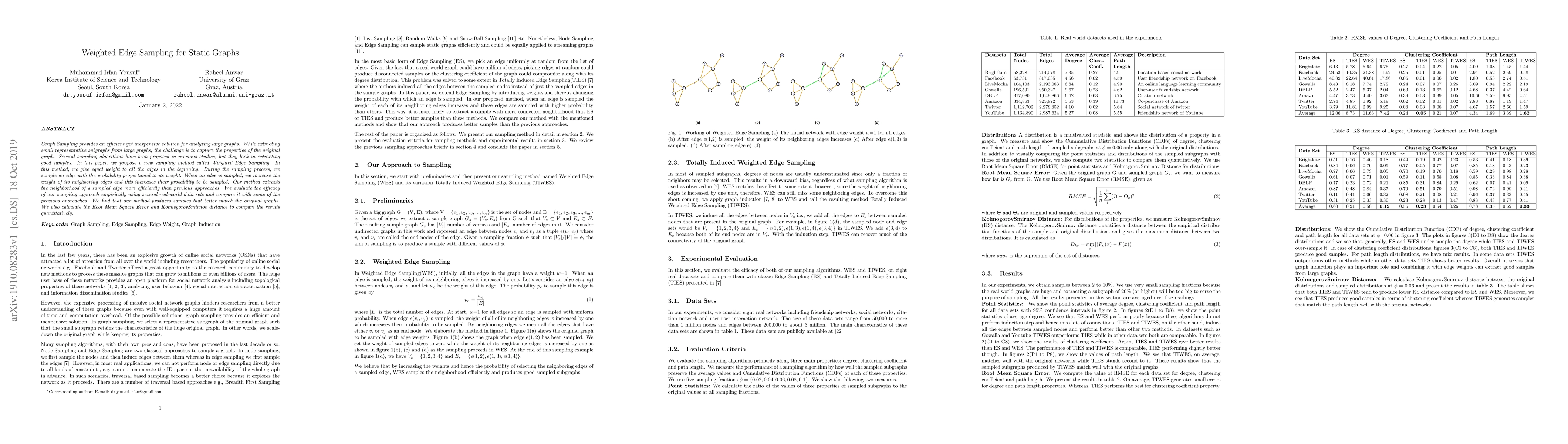 Graph Sampling provides an efficient yet inexpensive solution for analyzing large graphs. While extracting small representative subgraphs from large graphs, the challenge is to capture the properties of the original graph. Several sampling algorithms have been proposed in previous studies, but they lack in extracting good samples. In this paper, we propose a new sampling method called Weighted Edge Sampling. In this method, we give equal weight to all the edges in the beginning. During the sampling process, we sample an edge with the probability proportional to its weight. When an edge is sampled, we increase the weight of its neighboring edges and this increases their probability to be sampled. Our method extracts the neighborhood of a sampled edge more efficiently than previous approaches. We evaluate the efficacy of our sampling approach empirically using several real-world data sets and compare it with some of the previous approaches. We find that our method produces samples that better match the original graphs. We also calculate the Root Mean Square Error and Kolmogorov Smirnov distance to compare the results quantitatively.