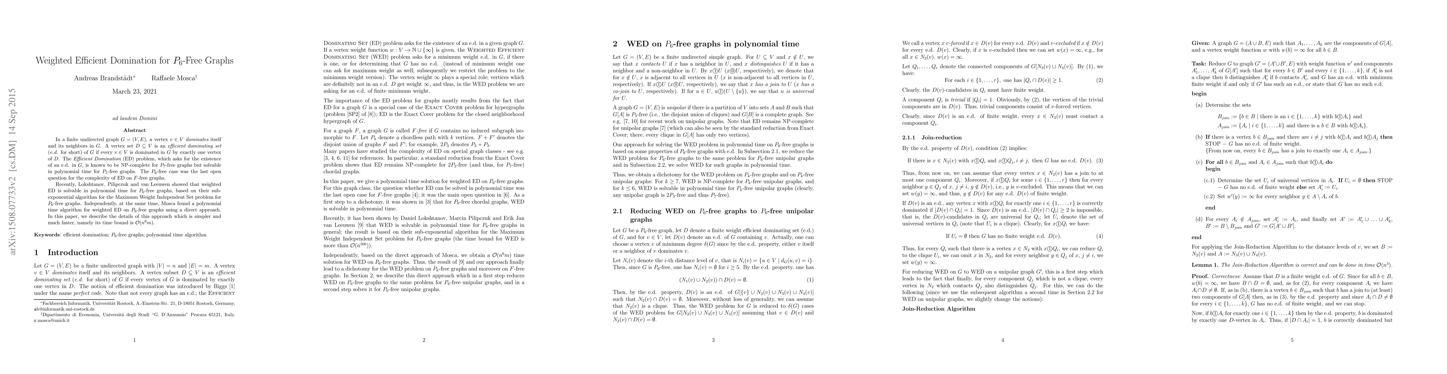 This paper presents a polynomial-time algorithm with a time complexity of $O(n^6 m)$ for solving the weighted Efficient Domination problem on $P_6$-free graphs, providing a simpler and faster solution compared to previously known sub-exponential algorithms. The algorithm independently discovered by Mosca addresses the last open question on the complexity of the Efficient Domination problem for $P_6$-free graphs.