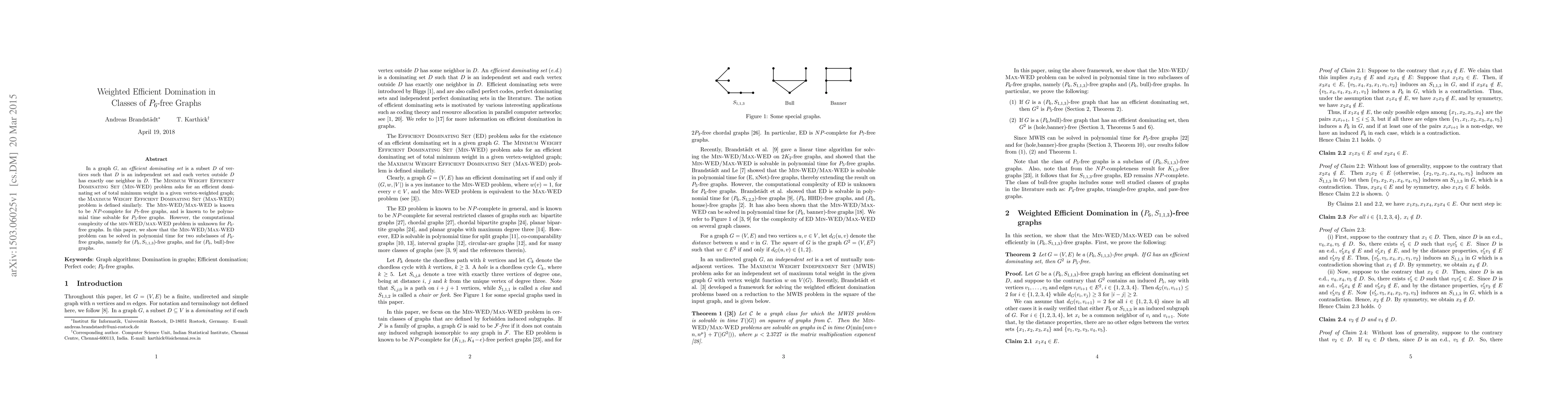 This paper addresses the computational complexity of the Minimum Weight Efficient Dominating Set (Min-WED) and Maximum Weight Efficient Dominating Set (Max-WED) problems for $P_6$-free graphs, proving that they can be solved in polynomial time for two specific subclasses: ($P_6,S_{1,1,3}$)-free graphs and ($P_6$, bull)-free graphs.