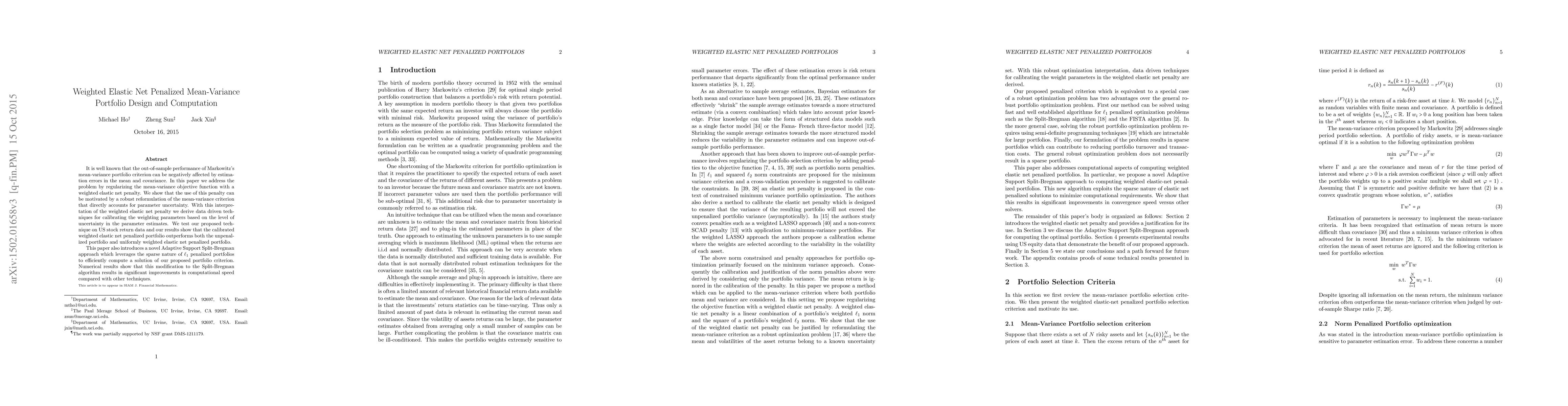 This paper proposes a weighted elastic net penalty to regularize Markowitz's mean-variance portfolio criterion, addressing estimation errors through a robust reformulation. The method outperforms traditional portfolios and employs an Adaptive Support Split-Bregman approach for efficient computation, significantly improving speed.