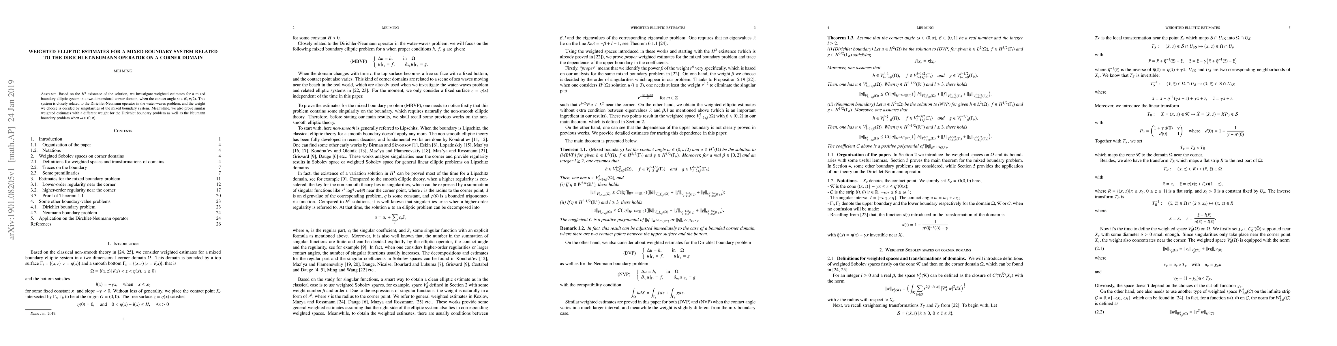 Based on the $H^2$ existence of the solution, we investigate weighted estimates for a mixed boundary elliptic system in a two-dimensional corner domain, when the contact angle $\om\in(0,\pi/2)$. This system is closely related to the Dirichlet-Neumann operator in the water-waves problem, and the weight we choose is decided by singularities of the mixed boundary system. Meanwhile, we also prove similar weighted estimates with a different weight for the Dirichlet boundary problem as well as the Neumann boundary problem when $\om\in(0,\pi)$.