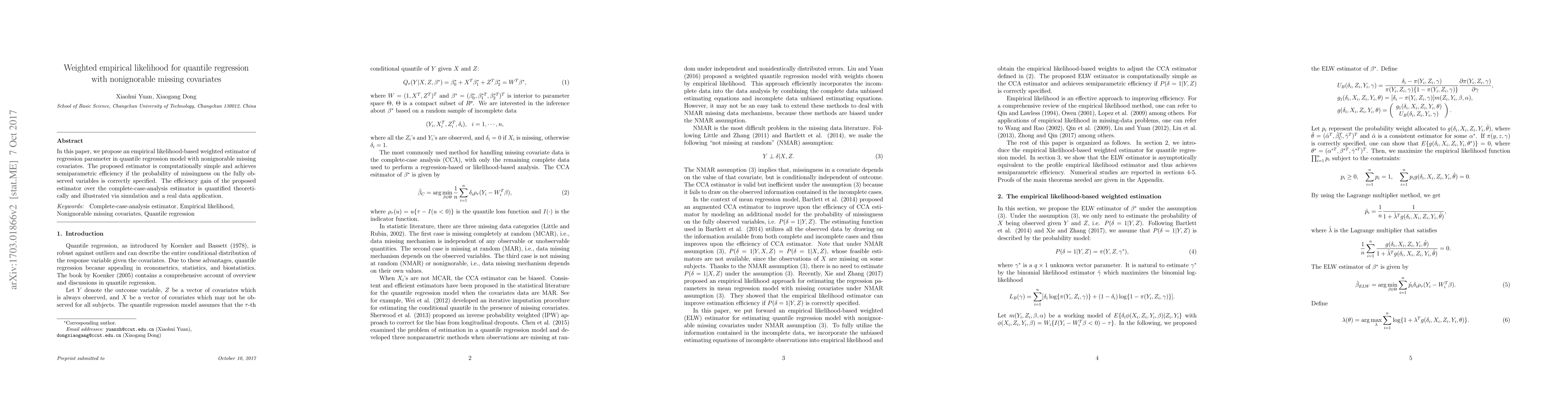 The paper introduces a weighted empirical likelihood approach for estimating conditional quantile functions in linear models with nonignorable missing covariates, ensuring semiparametric efficiency under correct specification of the missingness probability.