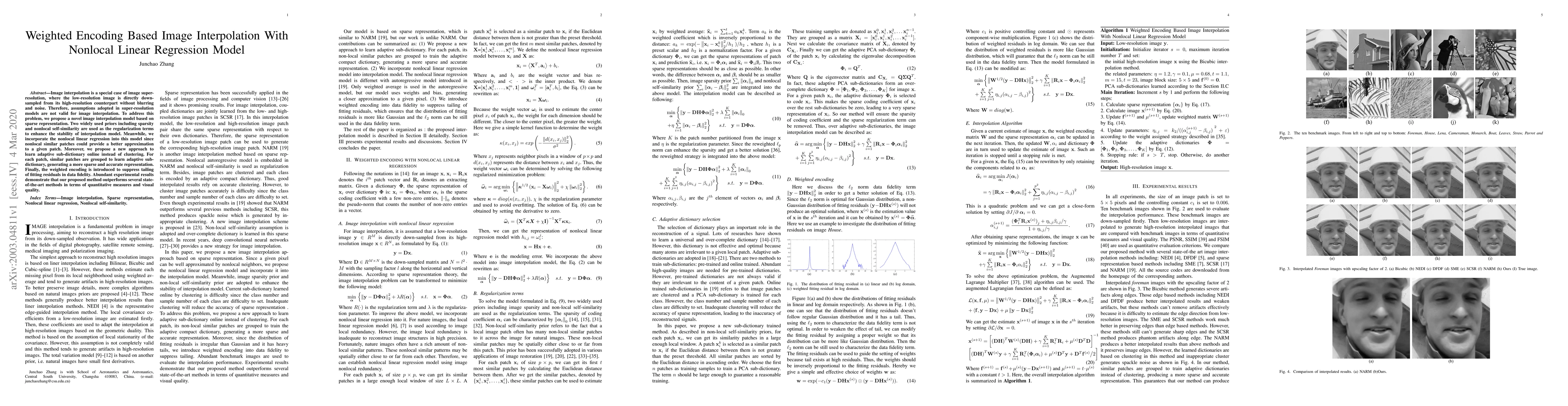Image interpolation is a special case of image super-resolution, where the low-resolution image is directly down-sampled from its high-resolution counterpart without blurring and noise. Therefore, assumptions adopted in super-resolution models are not valid for image interpolation. To address this problem, we propose a novel image interpolation model based on sparse representation. Two widely used priors including sparsity and nonlocal self-similarity are used as the regularization terms to enhance the stability of interpolation model. Meanwhile, we incorporate the nonlocal linear regression into this model since nonlocal similar patches could provide a better approximation to a given patch. Moreover, we propose a new approach to learn adaptive sub-dictionary online instead of clustering. For each patch, similar patches are grouped to learn adaptive sub-dictionary, generating a more sparse and accurate representation. Finally, the weighted encoding is introduced to suppress tailing of fitting residuals in data fidelity. Abundant experimental results demonstrate that our proposed method outperforms several state-of-the-art methods in terms of quantitative measures and visual quality.