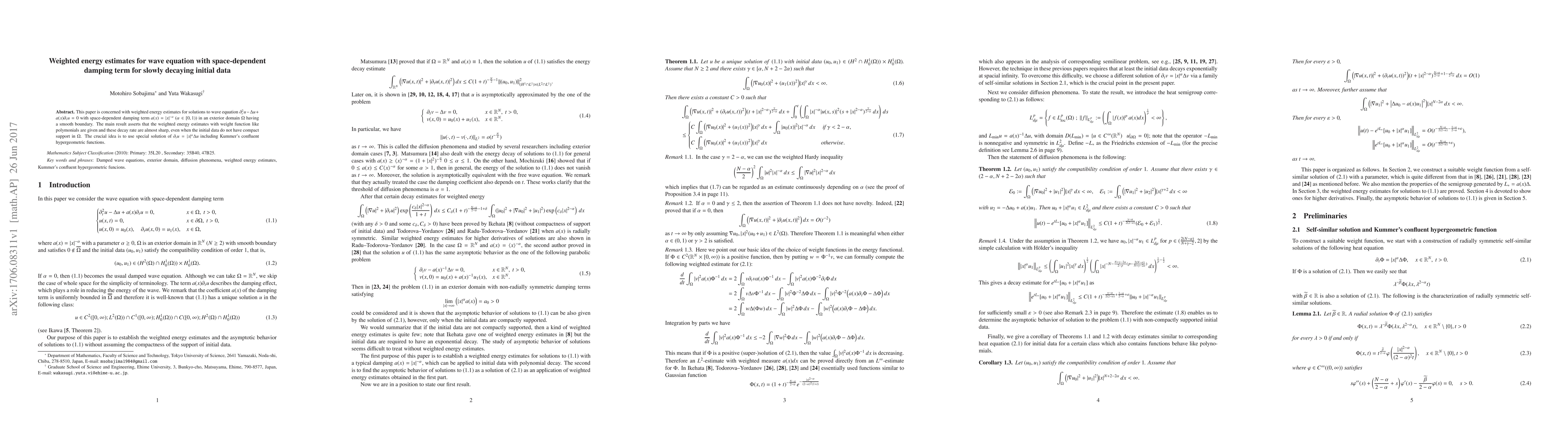 This paper provides weighted energy estimates for solutions to a wave equation with a space-dependent damping term, demonstrating almost sharp decay rates for slowly decaying initial data. The key technique involves utilizing special solutions incorporating Kummer's confluent hypergeometric functions.