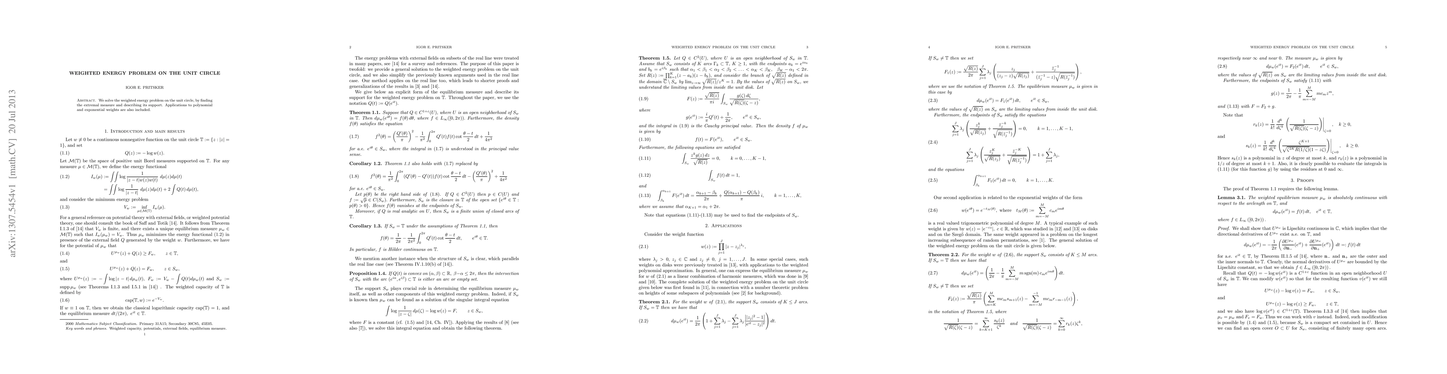 We solve the weighted energy problem on the unit circle, by finding the extremal measure and describing its support. Applications to polynomial and exponential weights are also included.