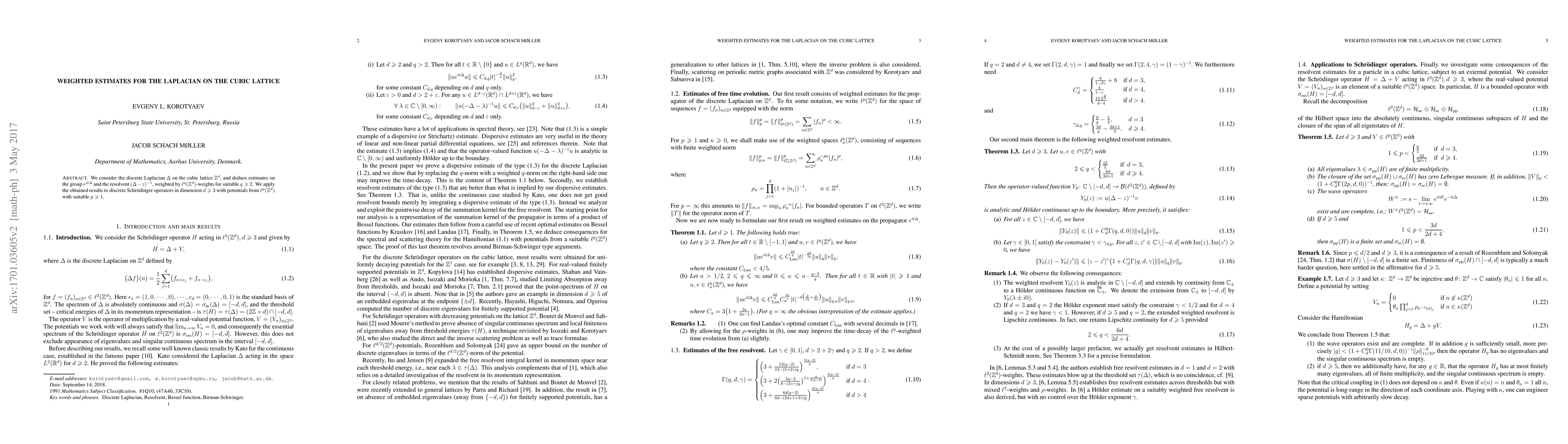 We consider the discrete Laplacian $\Delta$ on the cubic lattice $\mathbb Z^d$, and deduce estimates on the group $e^{it\Delta}$ and the resolvent $(\Delta-z)^{-1}$, weighted by $\ell^q(\mathbb Z^d)$-weights for suitable $q\geq 2$. We apply the obtained results to discrete Schr\"odinger operators in dimension $d\geq 3$ with potentials from $\ell^p(\mathbb Z^d)$ with suitable $p\geq 1$.