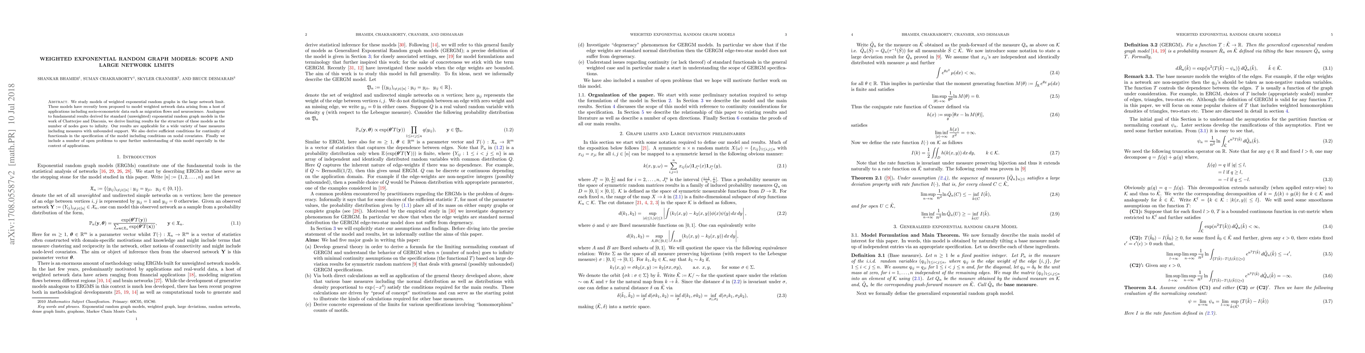This paper studies weighted exponential random graph models in large networks, deriving limiting results on their structure as the number of nodes approaches infinity. It also explores continuity conditions for functional specifications, including those involving nodal covariates.