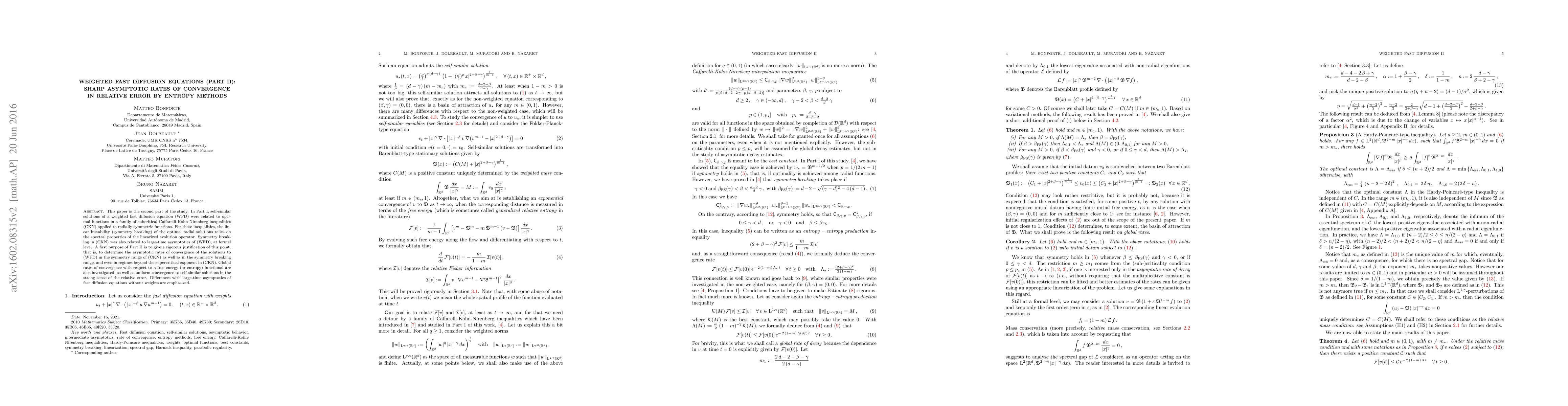 This paper is the second part of the study. In Part~I, self-similar solutions of a weighted fast diffusion equation (WFD) were related to optimal functions in a family of subcritical Caffarelli-Kohn-Nirenberg inequalities (CKN) applied to radially symmetric functions. For these inequalities, the linear instability (symmetry breaking) of the optimal radial solutions relies on the spectral properties of the linearized evolution operator. Symmetry breaking in (CKN) was also related to large-time asymptotics of (WFD), at formal level. A first purpose of Part~II is to give a rigorous justification of this point, that is, to determine the asymptotic rates of convergence of the solutions to (WFD) in the symmetry range of (CKN) as well as in the symmetry breaking range, and even in regimes beyond the supercritical exponent in (CKN). Global rates of convergence with respect to a free energy (or entropy) functional are also investigated, as well as uniform convergence to self-similar solutions in the strong sense of the relative error. Differences with large-time asymptotics of fast diffusion equations without weights will be emphasized.