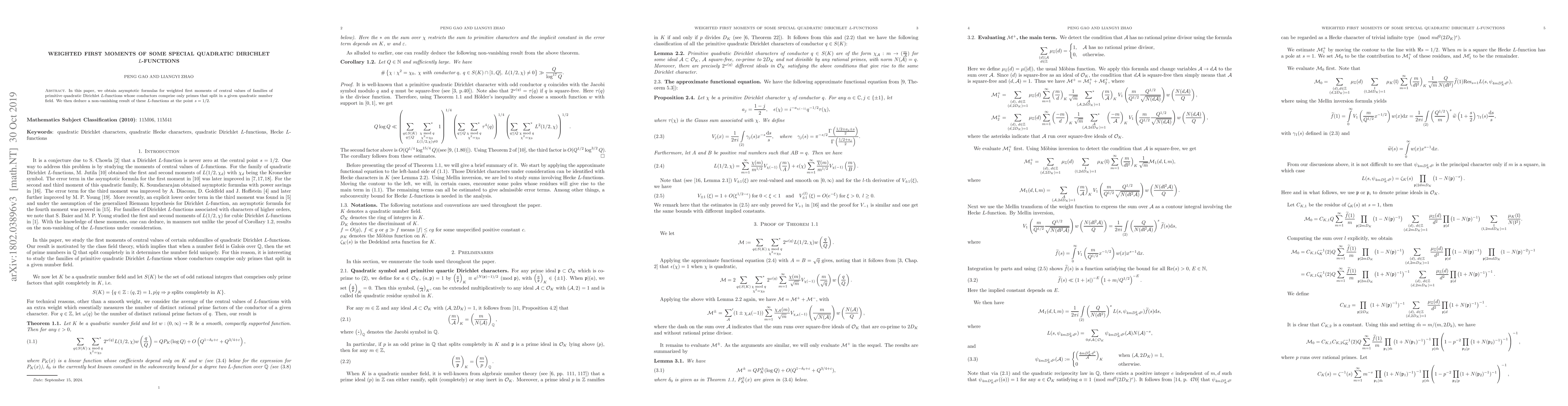 This paper provides asymptotic formulas for weighted first moments of central values of specific primitive quadratic Dirichlet $L$-functions, focusing on those whose conductors are primes splitting in a particular quadratic number field, and proves non-vanishing at $s=1/2$.