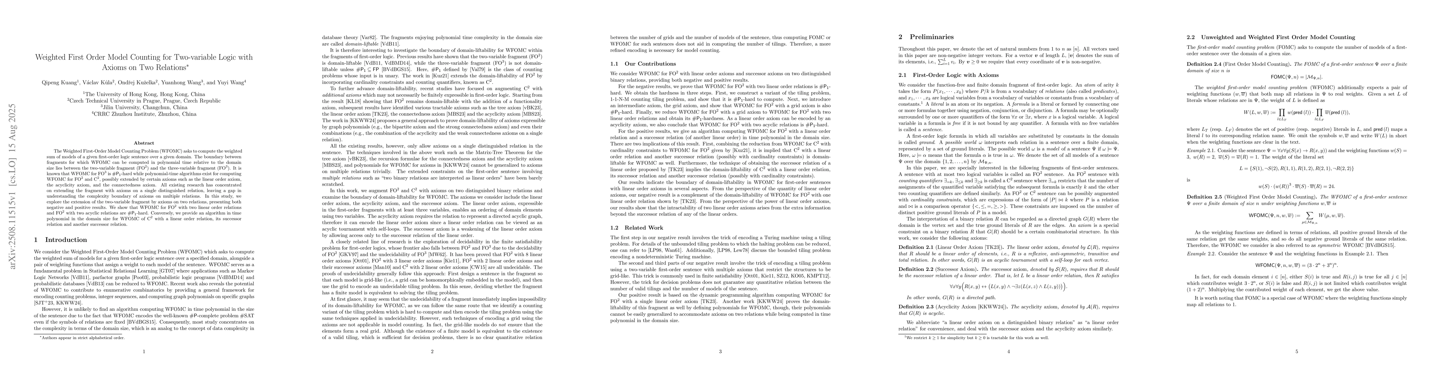 The Weighted First-Order Model Counting Problem (WFOMC) asks to compute the weighted sum of models of a given first-order logic sentence over a given domain. The boundary between fragments for which WFOMC can be computed in polynomial time relative to the domain size lies between the two-variable fragment ($\text{FO}^2$) and the three-variable fragment ($\text{FO}^3$). It is known that WFOMC for \FOthree{} is $\mathsf{\#P_1}$-hard while polynomial-time algorithms exist for computing WFOMC for $\text{FO}^2$ and $\text{C}^2$, possibly extended by certain axioms such as the linear order axiom, the acyclicity axiom, and the connectedness axiom. All existing research has concentrated on extending the fragment with axioms on a single distinguished relation, leaving a gap in understanding the complexity boundary of axioms on multiple relations. In this study, we explore the extension of the two-variable fragment by axioms on two relations, presenting both negative and positive results. We show that WFOMC for $\text{FO}^2$ with two linear order relations and $\text{FO}^2$ with two acyclic relations are $\mathsf{\#P_1}$-hard. Conversely, we provide an algorithm in time polynomial in the domain size for WFOMC of $\text{C}^2$ with a linear order relation, its successor relation and another successor relation.