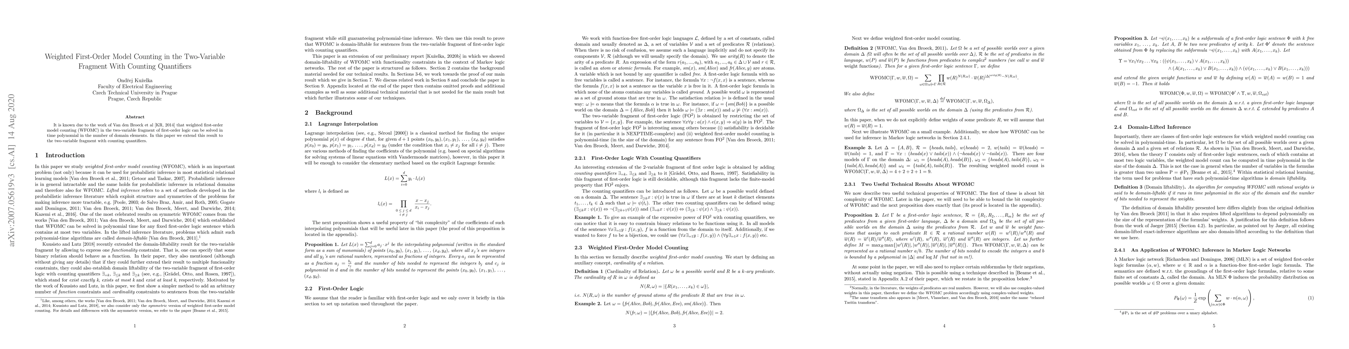 This paper extends the polynomial-time solution for weighted first-order model counting in the two-variable fragment to also include counting quantifiers, building on the foundational work of Van den Broeck et al. [KR, 2014].