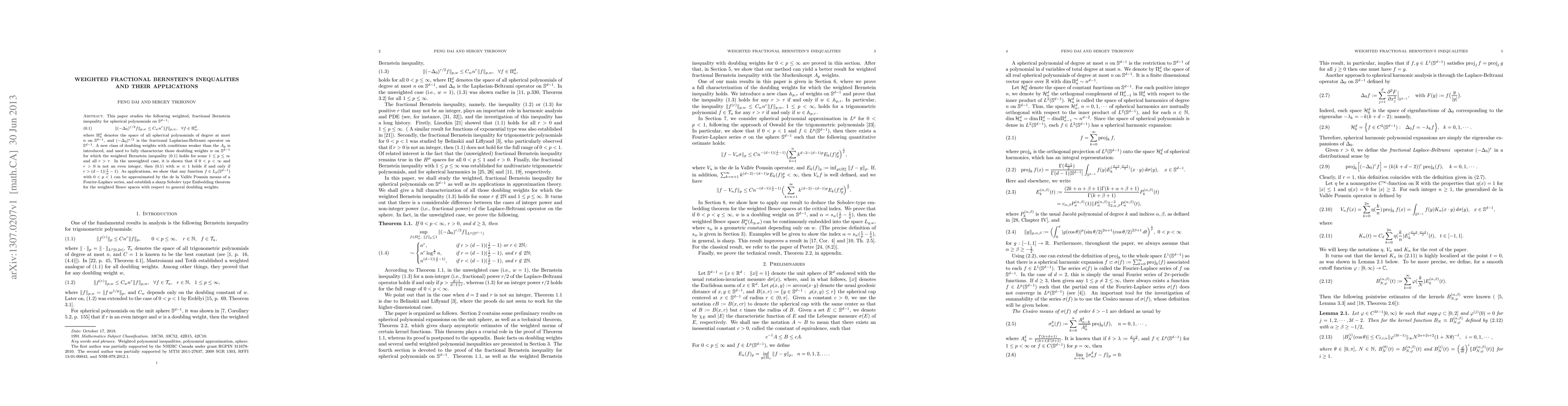 This research introduces a weighted, fractional Bernstein inequality for spherical polynomials, characterizing doubling weights weaker than the A_p class. It also demonstrates approximation of functions in L_p(sph) for 0<p<1 using de la Vallée Poussin means and establishes a sharp Sobolev type Embedding theorem for weighted Besov spaces with general doubling weights.