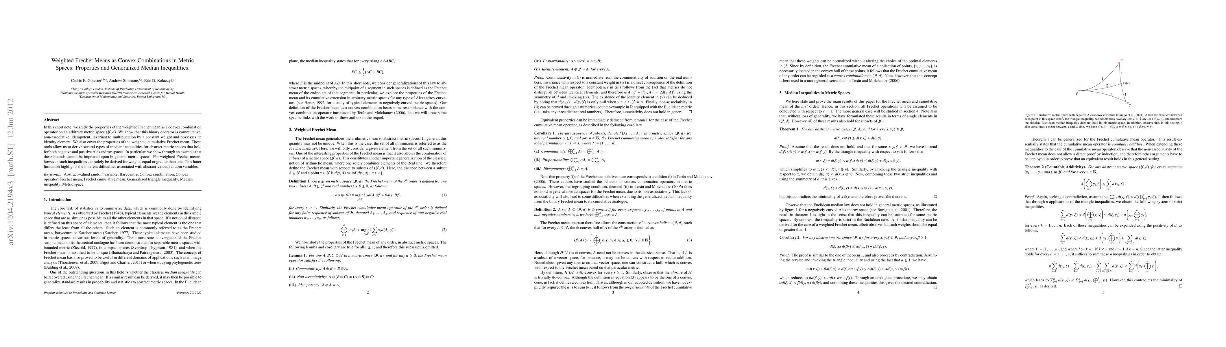 In this short note, we study the properties of the weighted Frechet mean as a convex combination operator on an arbitrary metric space, (Y,d). We show that this binary operator is commutative, non-associative, idempotent, invariant to multiplication by a constant weight and possesses an identity element. We also treat the properties of the weighted cumulative Frechet mean. These tools allow us to derive several types of median inequalities for abstract metric spaces that hold for both negative and positive Alexandrov spaces. In particular, we show through an example that these bounds cannot be improved upon in general metric spaces. For weighted Frechet means, however, such inequalities can solely be derived for weights equal or greater than one. This latter limitation highlights the inherent difficulties associated with working with abstract-valued random variables.