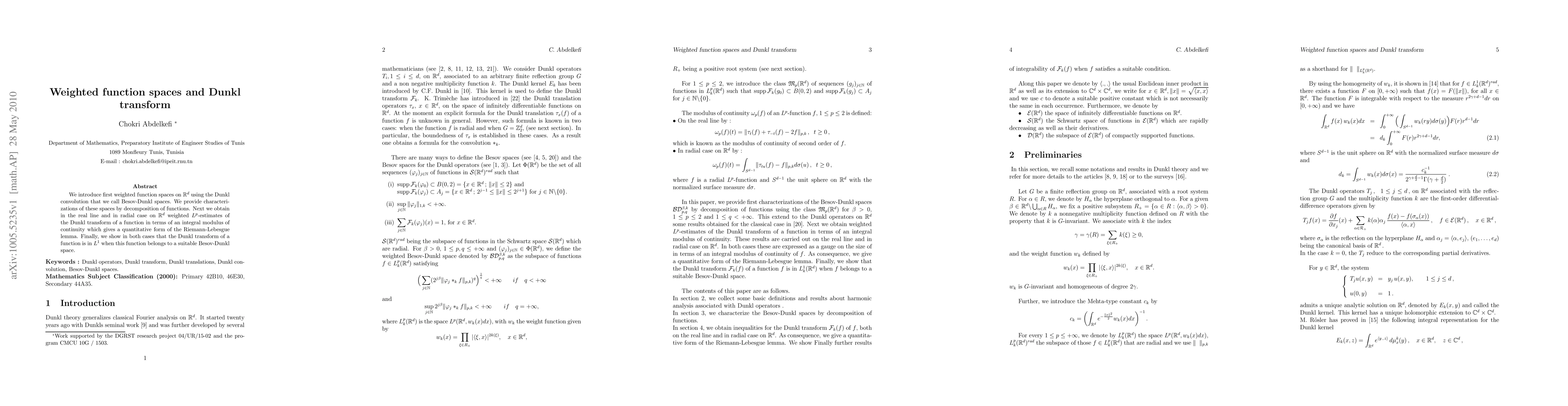 This paper introduces Besov-Dunkl spaces, weighted function spaces on Rd using the Dunkl convolution, and provides their characterizations via function decomposition. It also establishes weighted Lp-estimates for the Dunkl transform in terms of an integral modulus of continuity, demonstrating the Dunkl transform's L1 membership for functions in suitable Besov-Dunkl spaces.