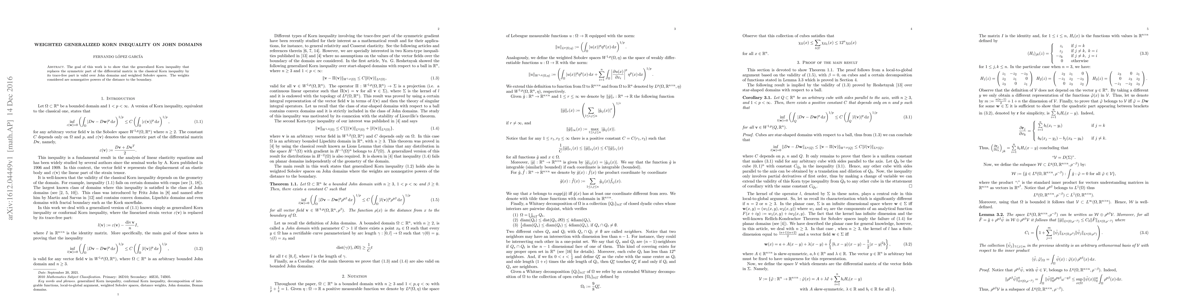 The goal of this work is to show that the generalized Korn inequality that replaces the symmetric part of the differential matrix in the classical Korn inequality by its trace-free part is valid over John domains and weighted Sobolev spaces. The weights considered are nonnegative powers of the distance to the boundary.