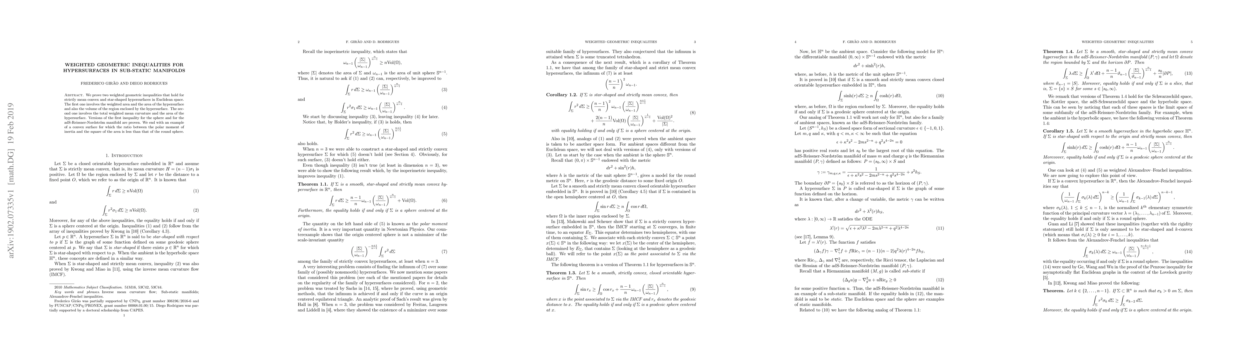 Researchers prove two weighted geometric inequalities for hypersurfaces in sub-static manifolds, providing insights into the relationship between surface area, volume, and curvature, with applications in understanding convex surfaces and exotic spacetimes.