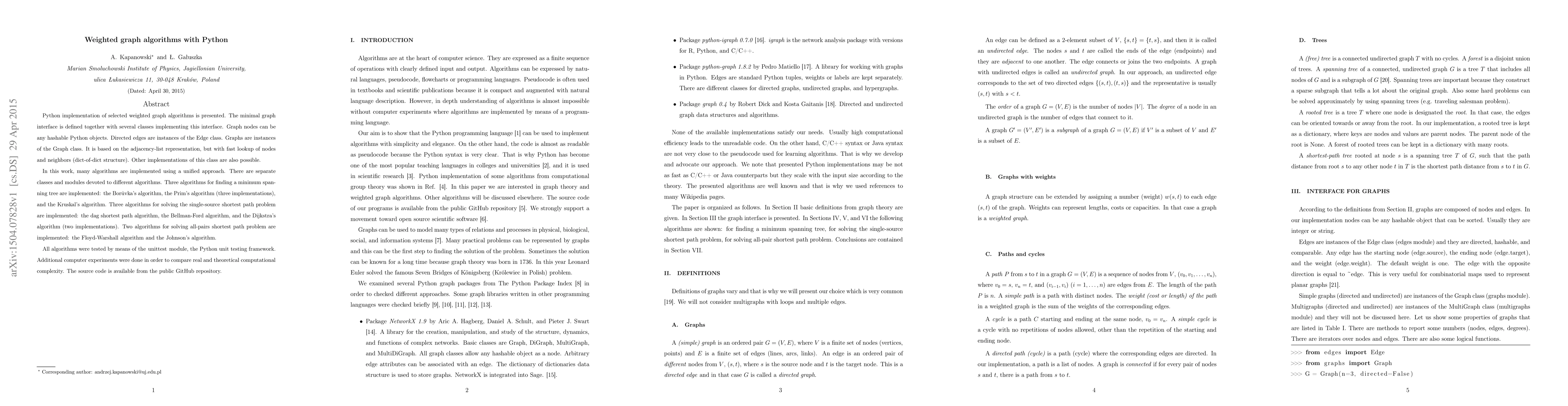 Python implementation of selected weighted graph algorithms is presented. The minimal graph interface is defined together with several classes implementing this interface. Graph nodes can be any hashable Python objects. Directed edges are instances of the Edge class. Graphs are instances of the Graph class. It is based on the adjacency-list representation, but with fast lookup of nodes and neighbors (dict-of-dict structure). Other implementations of this class are also possible. In this work, many algorithms are implemented using a unified approach. There are separate classes and modules devoted to different algorithms. Three algorithms for finding a minimum spanning tree are implemented: the Boruvka's algorithm, the Prim's algorithm (three implementations), and the Kruskal's algorithm. Three algorithms for solving the single-source shortest path problem are implemented: the dag shortest path algorithm, the Bellman-Ford algorithm, and the Dijkstra's algorithm (two implementations). Two algorithms for solving all-pairs shortest path problem are implemented: the Floyd-Warshall algorithm and the Johnson's algorithm. All algorithms were tested by means of the unittest module, the Python unit testing framework. Additional computer experiments were done in order to compare real and theoretical computational complexity. The source code is available from the public GitHub repository.
