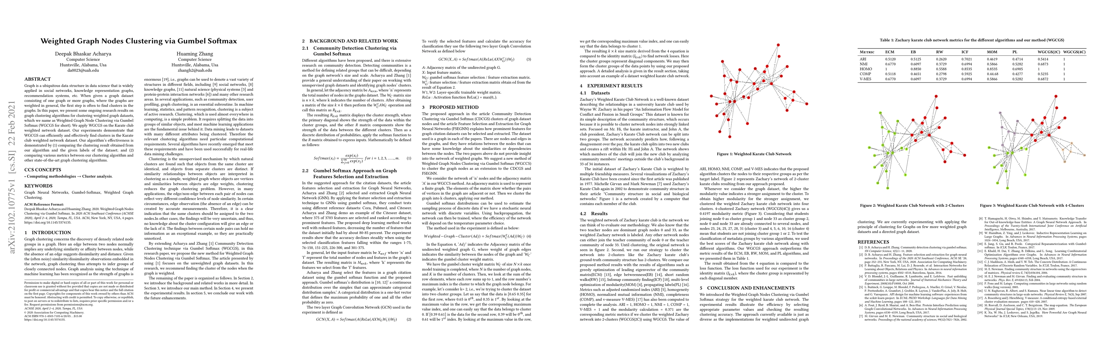 This paper introduces a new graph clustering algorithm, Weighted Graph Node Clustering via Gumbel Softmax (WGCGS), for efficiently identifying clusters in weighted graph datasets. Experiments on the Karate club dataset show that WGCGS outperforms other state-of-the-art methods in both accuracy and efficiency.
