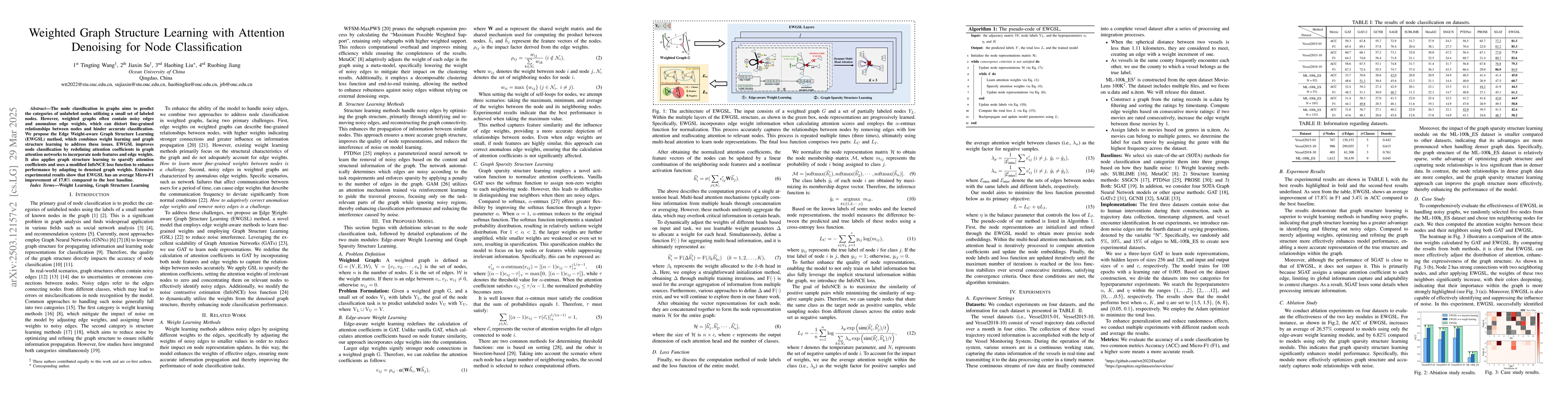 The paper proposes Edge Weight-aware Graph Structure Learning (EWGSL) for node classification in noisy weighted graphs, integrating weight learning and graph structure learning to improve classification accuracy by redefining attention coefficients and using a modified InfoNCE loss function.