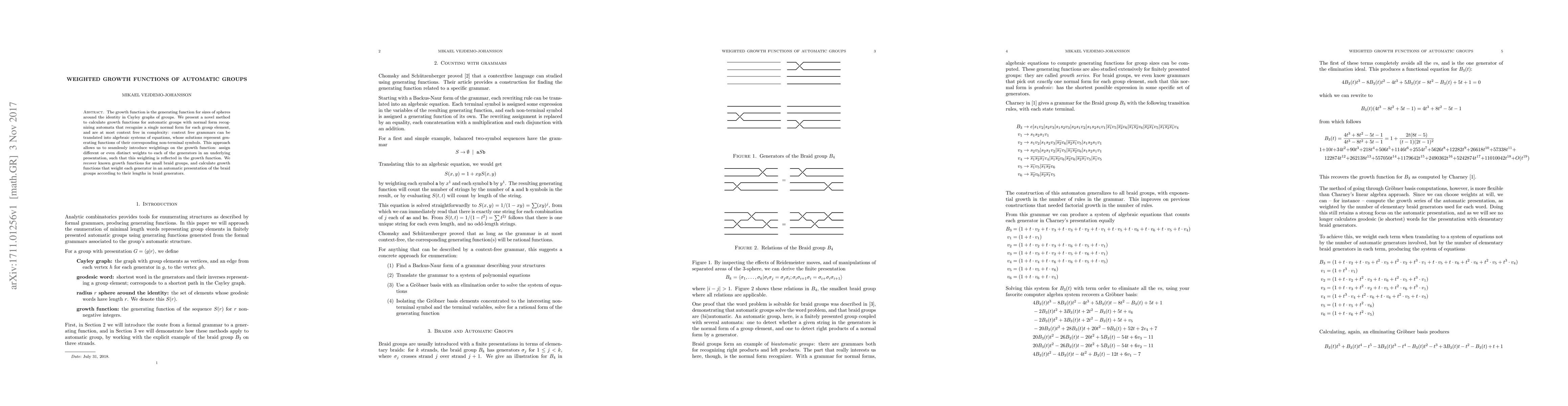 The growth function is the generating function for sizes of spheres around the identity in Cayley graphs of groups. We present a novel method to calculate growth functions for automatic groups with normal form recognizing automata that recognize a single normal form for each group element, and are at most context free in complexity: context free grammars can be translated into algebraic systems of equations, whose solutions represent generating functions of their corresponding non-terminal symbols. This approach allows us to seamlessly introduce weightings on the growth function: assign different or even distinct weights to each of the generators in an underlying presentation, such that this weighting is reflected in the growth function. We recover known growth functions for small braid groups, and calculate growth functions that weight each generator in an automatic presentation of the braid groups according to their lengths in braid generators.