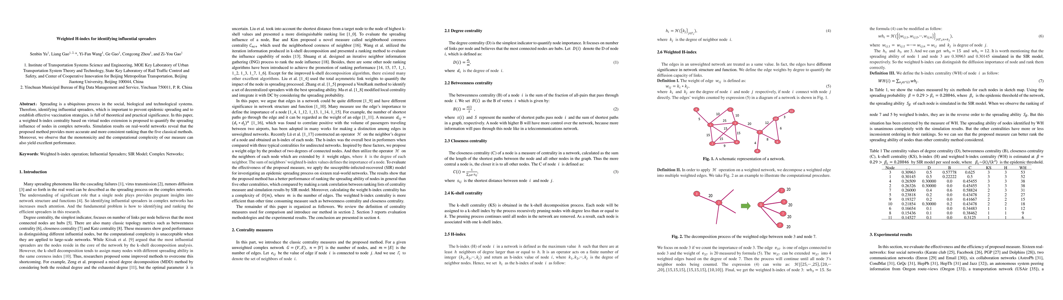 The research proposes a weighted h-index centrality (WH) to identify influential spreaders in complex networks, using the SIR model for spreading simulations and evaluating performance via Kendall's tau and imprecision function. The study compares WH with five other centrality measures across sixteen real-world networks.