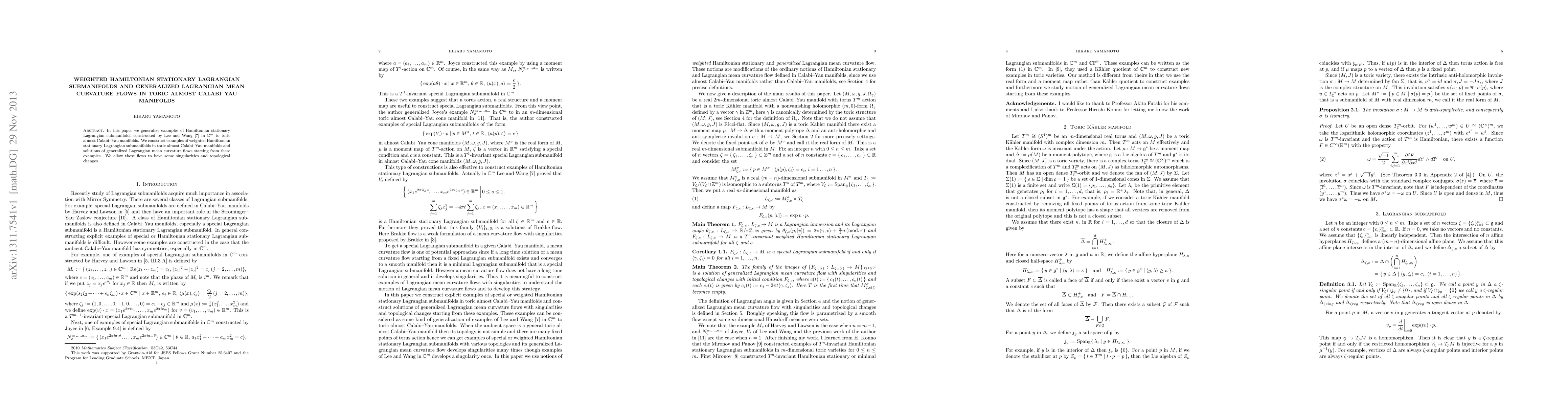 This paper generalizes Hamiltonian stationary Lagrangian submanifolds to toric almost Calabi-Yau manifolds, constructing weighted examples and exploring solutions to generalized Lagrangian mean curvature flows, permitting singularities and topological changes.