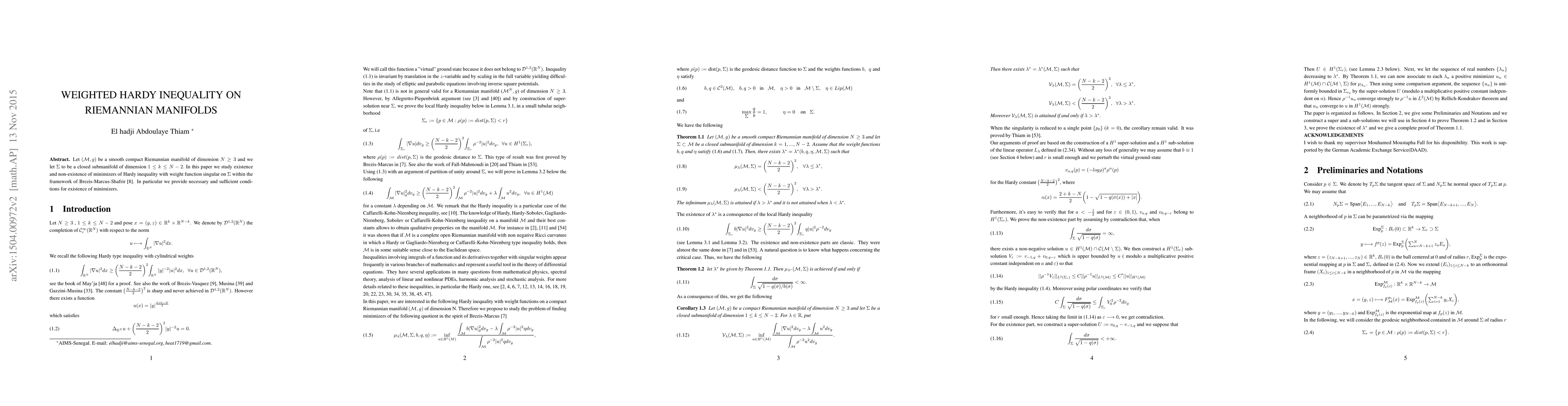 Let $(M,g)$ be a smooth compact Riemannian manifold of dimension $N\geq 3$ and we let $\Sigma$ to be a closed submanifold of dimension $1 \leq k \leq N-2. $ In this paper we study existence and non-existence of minimizers of Hardy inequality with weight function singular on $\Sigma$ within the framework of Brezis-Marcus-Shafrir. In particular we provide necessary and sufficient conditions for existence of minimizers.