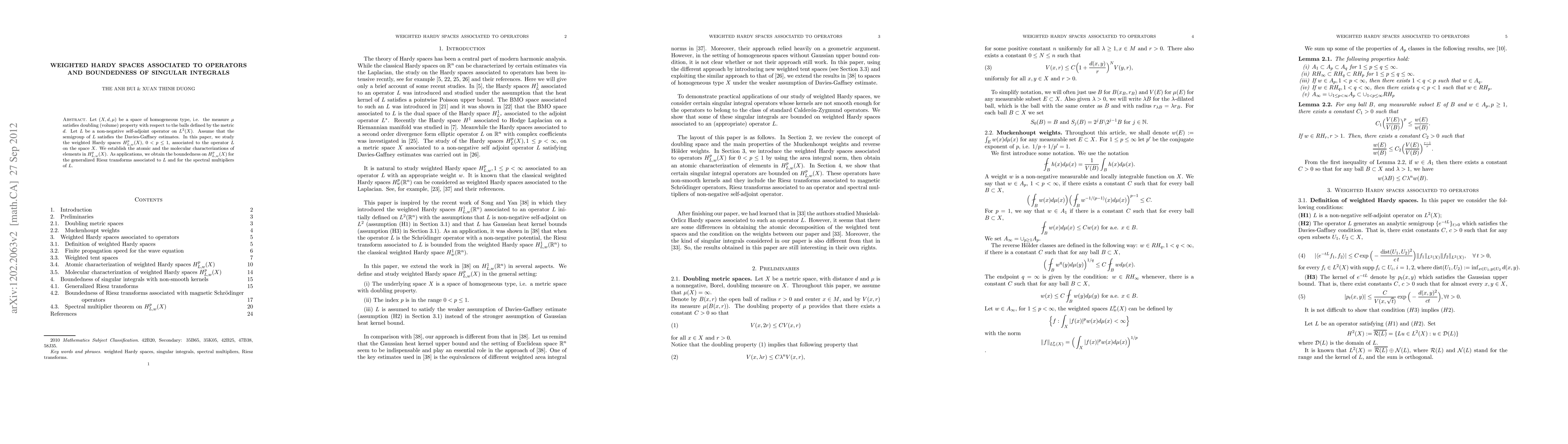 Let $(X, d, \mu)$ be a space of homogeneous type, i.e. the measure $\mu$ satisfies doubling (volume) property with respect to the balls defined by the metric $d$. Let $L$ be a non-negative self-adjoint operator on $L^2(X)$. Assume that the semigroup of $L$ satisfies the Davies-Gaffney estimates. In this paper, we study the weighted Hardy spaces $H^p_{L,w}(X)$, $0 < p \le 1$, associated to the operator $L$ on the space $X$. We establish the atomic and the molecular characterizations of elements in $H^p_{L,w}(X)$. As applications, we obtain the boundedness on $\HL$ for the generalized Riesz transforms associated to $L$ and for the spectral multipliers of $L$.