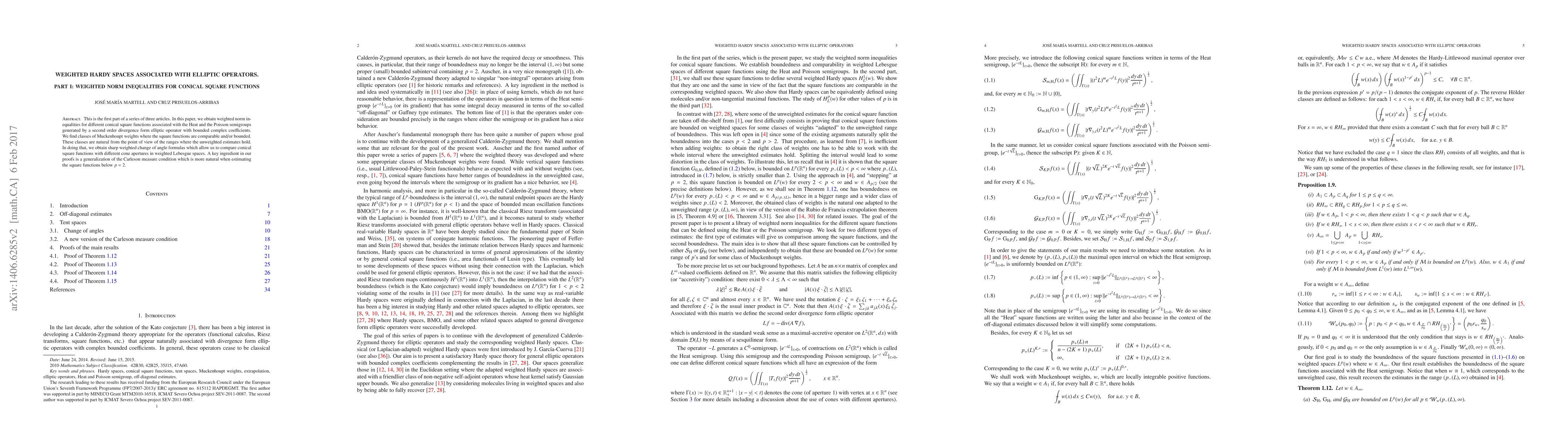 This paper establishes weighted norm inequalities for conical square functions associated with elliptic operators, identifying classes of Muckenhoupt weights where these functions are comparable or bounded. The study also derives sharp weighted change of angle formulas and generalizes the Carleson measure condition for estimates below $p=2$.