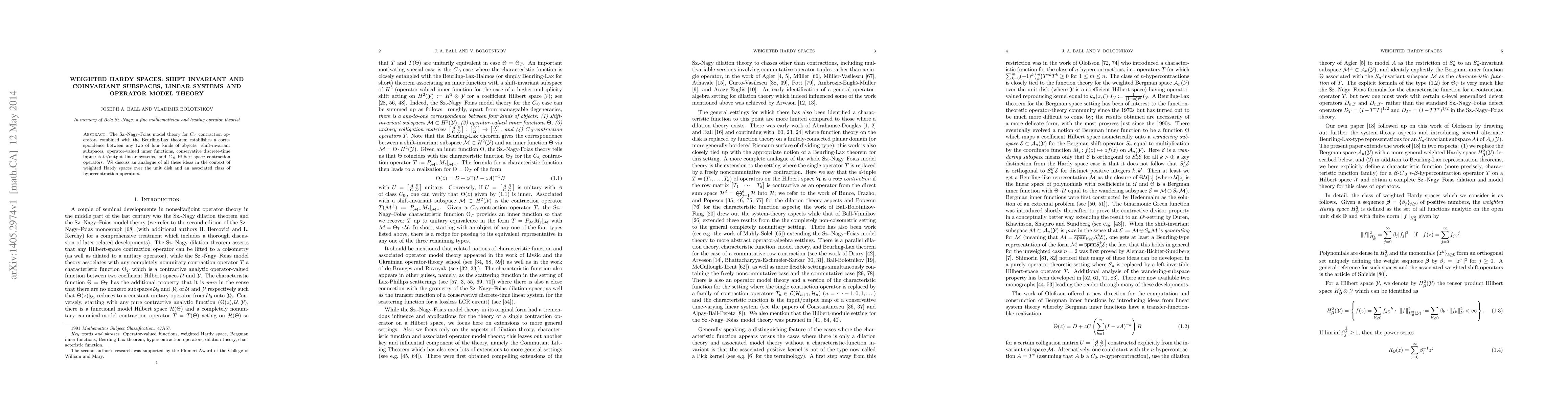 The Sz.-Nagy--Foias model theory for $C_{\cdot 0}$ contraction operators combined with the Beurling-Lax theorem establishes a correspondence between any two of four kinds of objects: shift-invariant subspaces, operator-valued inner functions, conservative discrete-time input/state/output linear systems, and $C_{\cdot 0}$ Hilbert-space contraction operators. We discuss an analogue of all these ideas in the context of weighted Hardy spaces over the unit disk and an associated class of hypercontraction operators.