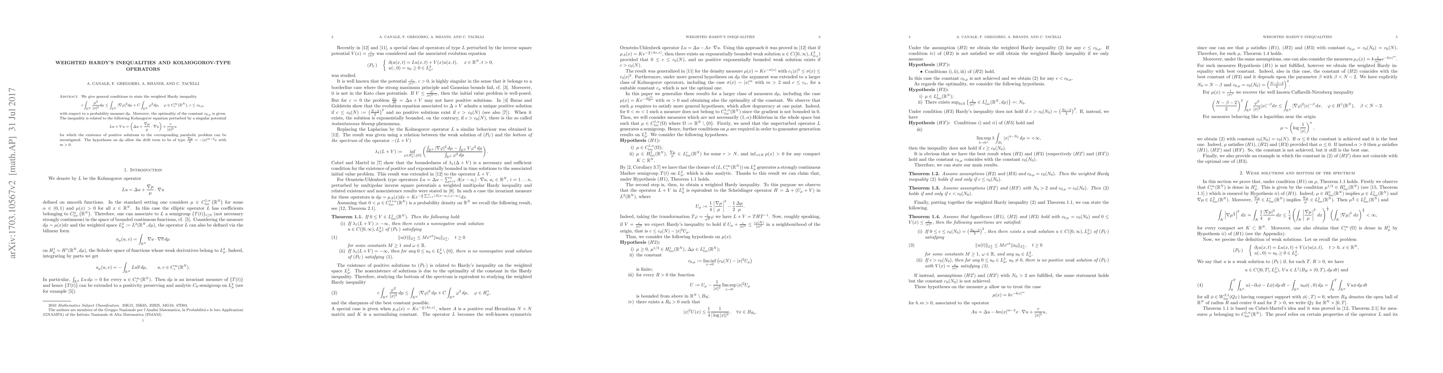 We give general conditions to state the weighted Hardy inequality \[ c\int_{\mathbb{R}^N}\frac{\varphi^2} {|x|^2}d\mu\leq\int_{\mathbb{R}^N}|\nabla \varphi |^2 d\mu+C\int_{\mathbb{R}^N} \varphi^2d\mu,\quad \varphi\in C_c^{\infty}(\mathbb{R}^N),\,c\leq c_{0,\mu}, \] with respect to a probability measure $d\mu$. Moreover, the optimality of the constant $c_{0,\mu}$ is given. The inequality is related to the following Kolmogorov equation perturbed by a singular potential \[ Lu+Vu=\left(\Delta u+\frac{\nabla \mu}{\mu}\cdot \nabla u\right)+\frac{c}{|x|^2}u \] for which the existence of positive solutions to the corresponding parabolic problem can be investigated. The hypotheses on $d\mu$ allow the drift term to be of type $\frac{\nabla \mu}{\mu}= -|x|^{m-2}x$ with $m> 0$.