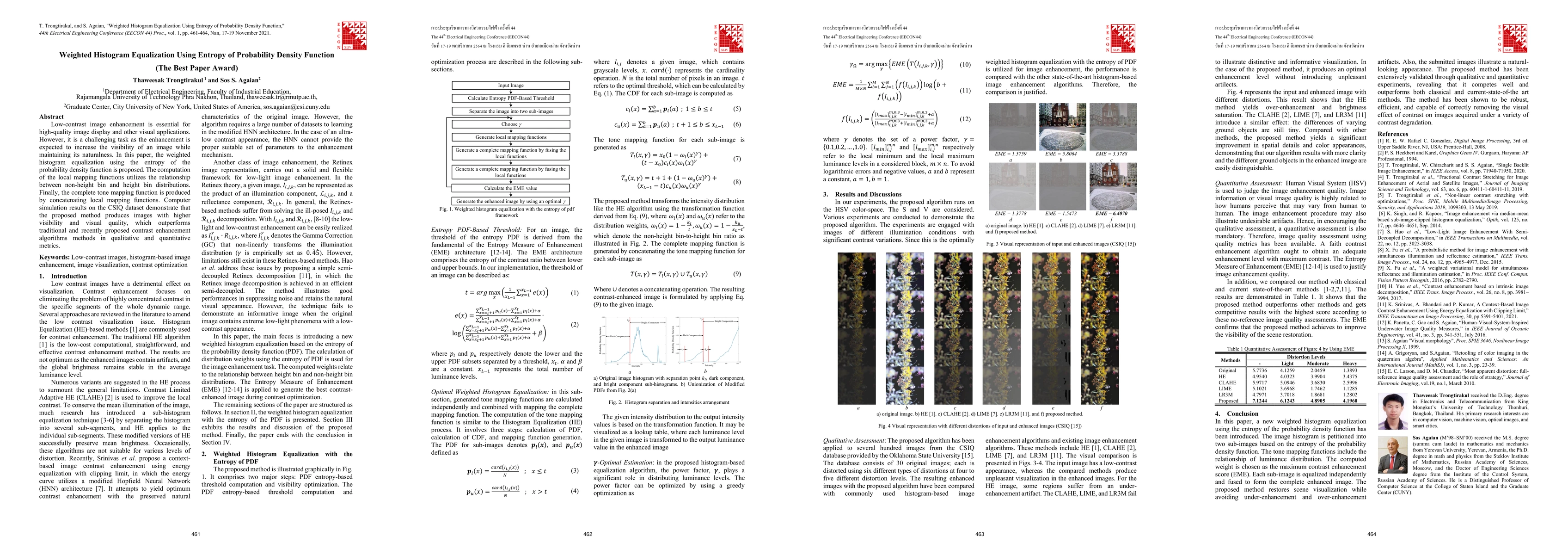 Low-contrast image enhancement is essential for high-quality image display and other visual applications. However, it is a challenging task as the enhancement is expected to increase the visibility of an image while maintaining its naturalness. In this paper, the weighted histogram equalization using the entropy of the probability density function is proposed. The computation of the local mapping functions utilizes the relationship between non-height bin and height bin distributions. Finally, the complete tone mapping function is produced by concatenating local mapping functions. Computer simulation results on the CSIQ dataset demonstrate that the proposed method produces images with higher visibility and visual quality, which outperforms traditional and recently proposed contrast enhancement algorithms methods in qualitative and quantitative metrics.