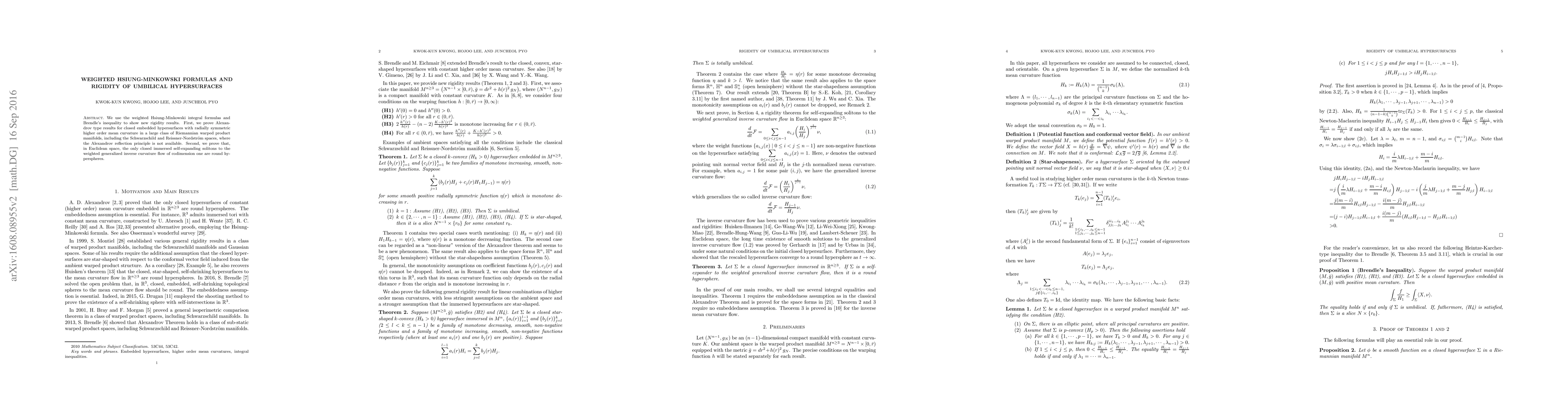 We use the weighted Hsiung-Minkowski integral formulas and Brendle's inequality to show new rigidity results. First, we prove Alexandrov type results for closed embedded hypersurfaces with radially symmetric higher order mean curvature in a large class of Riemannian warped product manifolds, including the Schwarzschild and Reissner-Nordstr\"{o}m spaces, where the Alexandrov reflection principle is not available. Second, we prove that, in Euclidean space, the only closed immersed self-expanding solitons to the weighted generalized inverse curvature flow of codimension one are round hyperspheres.