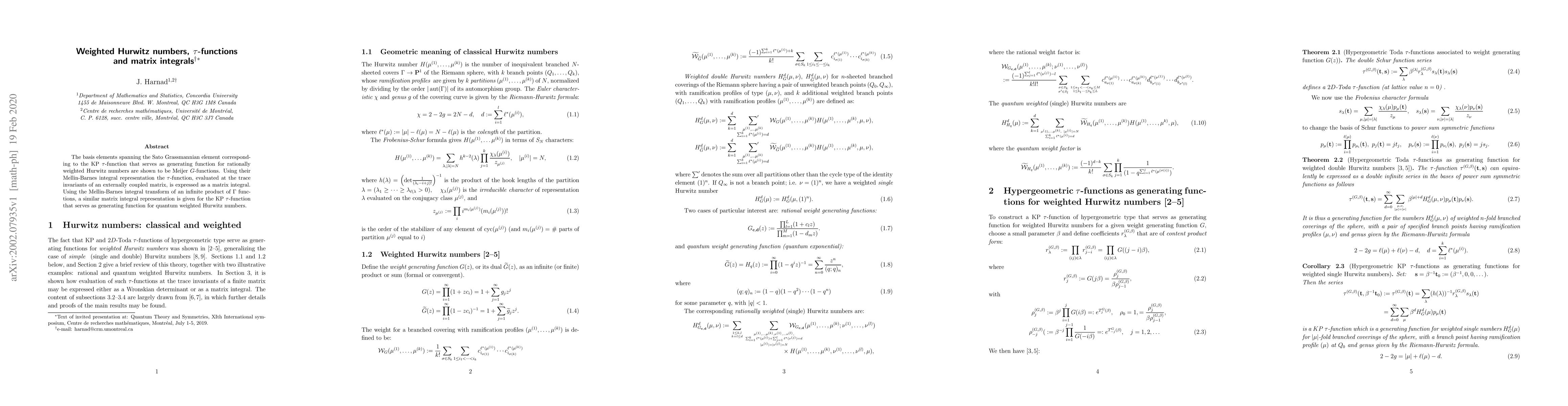 This paper demonstrates that the basis elements for the Sato Grassmannian element of the KP $\tau$-function, which generates rationally weighted Hurwitz numbers, are Meijer $G$-functions. It further expresses the $\tau$-function as a matrix integral using its Mellin-Barnes integral representation.