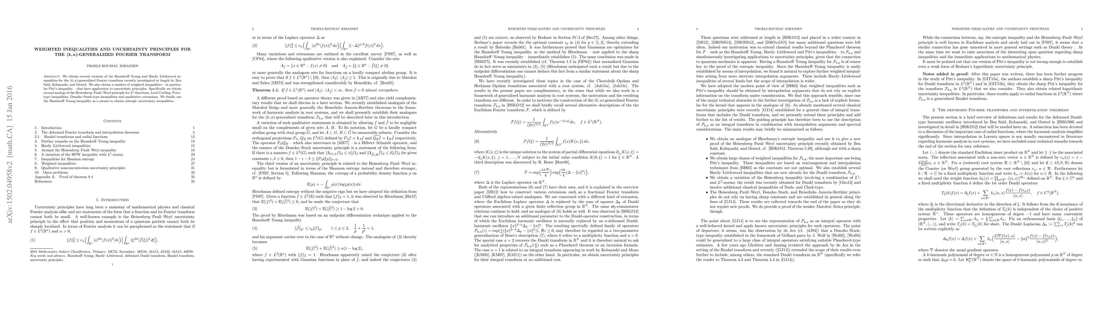 We obtain several versions of the Hausdorff-Young and Hardy-Littlewood inequalities for the $(k,a)$-generalized Fourier transform recently investigated at length by Ben Sa\"i d, Kobayashi, and {\O} rsted. We also obtain a number of weighted inequalities - in particular Pitt's inequality - that have application to uncertainty principles. Specifically we obtain several analogs of the Heisenberg-Pauli-Weyl principle for $L^p$-functions, local Cowling-Price-type inequalities, Donoho-Stark-type inequalities and qualitative extensions. We finally use the Hausdorff-Young inequality as a means to obtain entropic uncertainty inequalities.