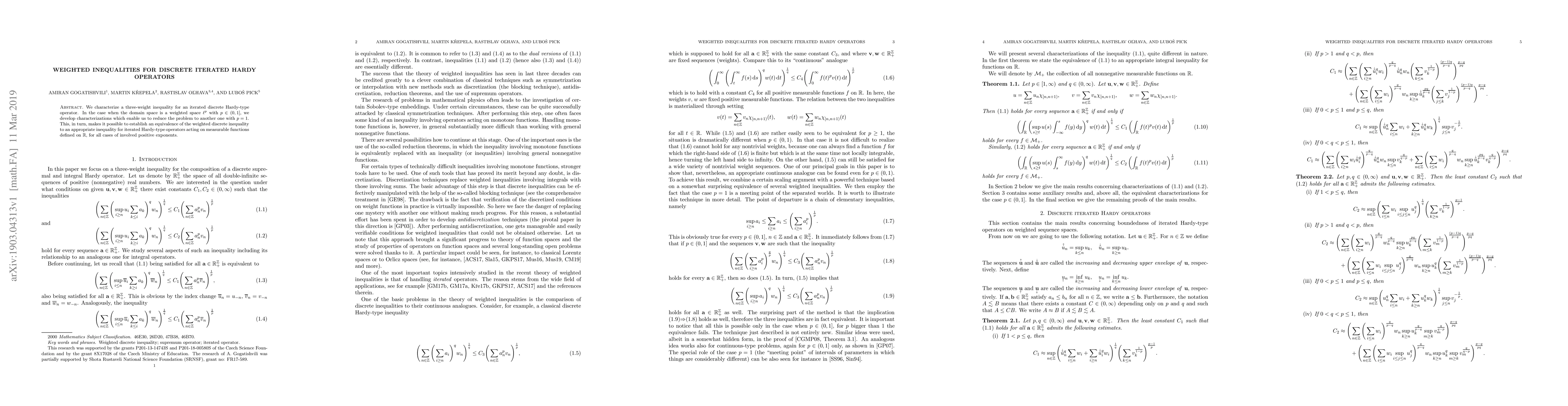 We characterize a three-weight inequality for an iterated discrete Hardy-type operator. In the case when the domain space is a weighted space $\ell^p$ with $p\in(0,1]$, we develop characterizations which enable us to reduce the problem to another one with $p=1$. This, in turn, makes it possible to establish an equivalence of the weighted discrete inequality to an appropriate inequality for iterated Hardy-type operators acting on measurable functions defined on $\mathbb{R}$, for all cases of involved positive exponents.