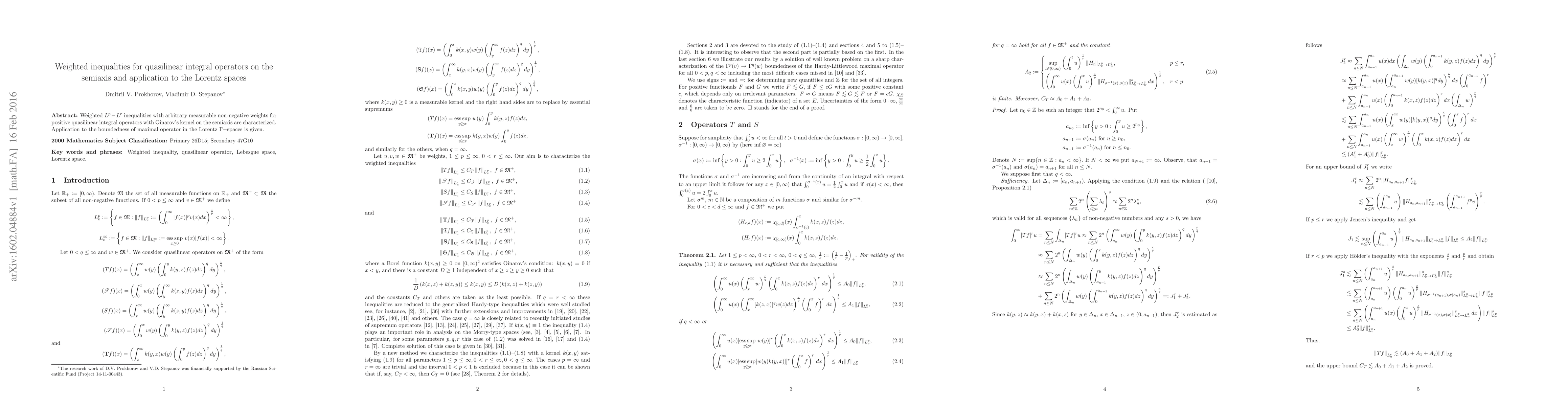 Research characterizes weighted $L^p-L^r$ inequalities for positive quasilinear integral operators on the semiaxis, with applications to boundedness of maximal operators in Lorentz $ ho$-spaces.