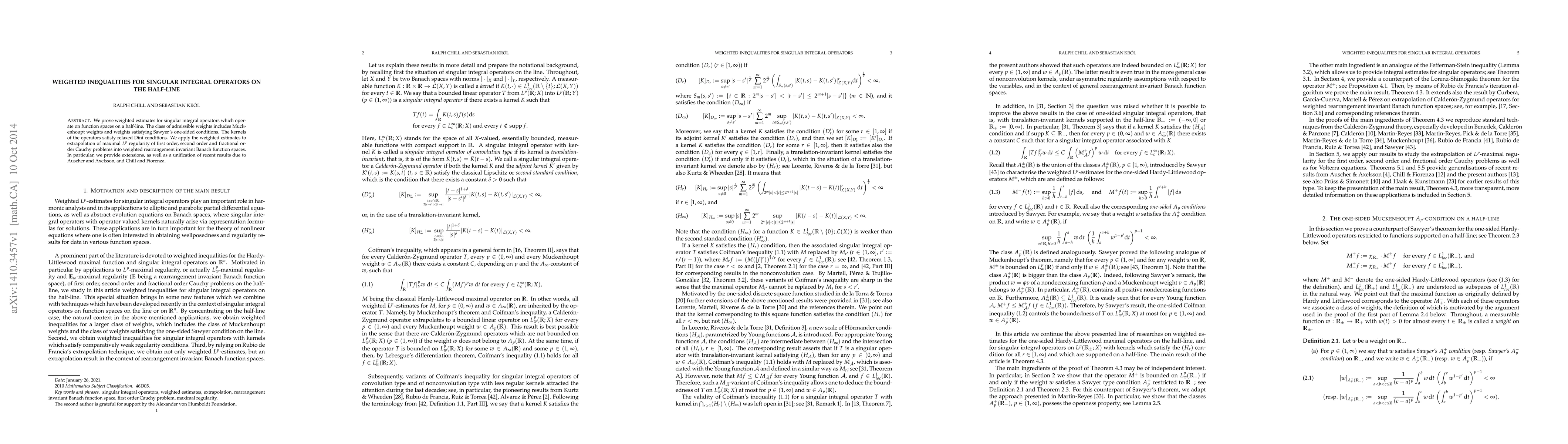 This paper establishes weighted inequalities for singular integral operators on the half-line, proving estimates for weights including Muckenhoupt and Sawyer's one-sided conditions. The results are applied to extend maximal $L^p$ regularity for various order Cauchy problems into weighted rearrangement invariant Banach function spaces.