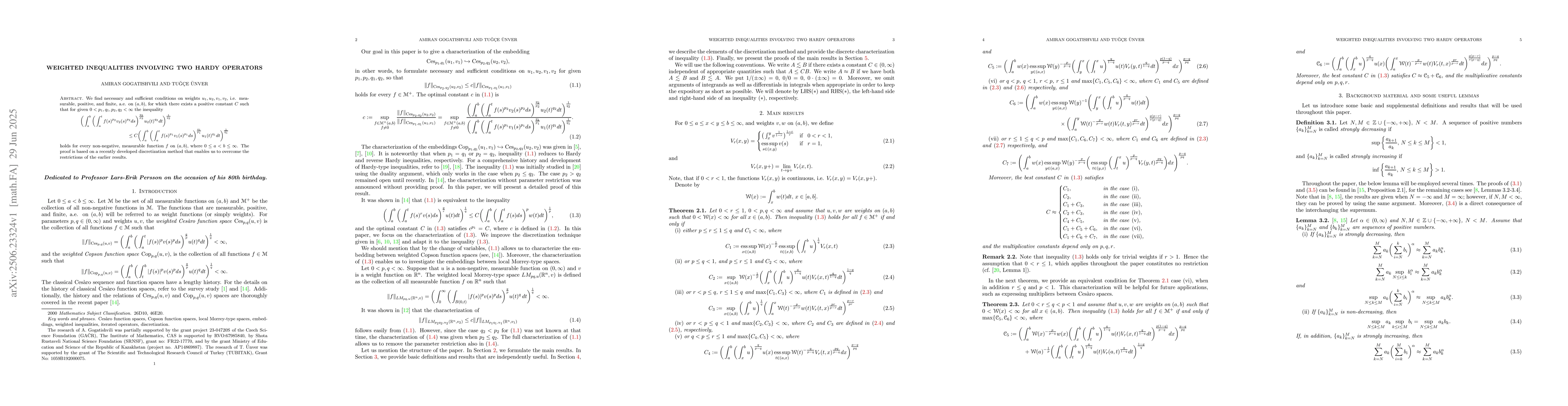 We find necessary and sufficient conditions on weights $u_1, u_2, v_1, v_2$, i.e. measurable, positive, and finite, a.e. on $(a,b)$, for which there exists a positive constant $C$ such that for given $0 < p_1,q_1,p_2,q_2 <\infty$ the inequality \begin{equation*} \begin{split} \bigg(\int_a^b \bigg(\int_a^t f(s)^{p_2} v_2(s)^{p_2} ds\bigg)^{\frac{q_2}{p_2}} u_2(t)^{q_2} dt \bigg)^{\frac{1}{q_2}}& \\ & \hspace{-3cm}\le C \bigg(\int_a^b \bigg(\int_a^t f(s)^{p_1} v_1(s)^{p_1} ds\bigg)^{\frac{q_1}{p_1}} u_1(t)^{q_1} dt \bigg)^{\frac{1}{q_1}} \end{split} \end{equation*} holds for every non-negative, measurable function $f$ on $(a,b)$, where $0 \le a