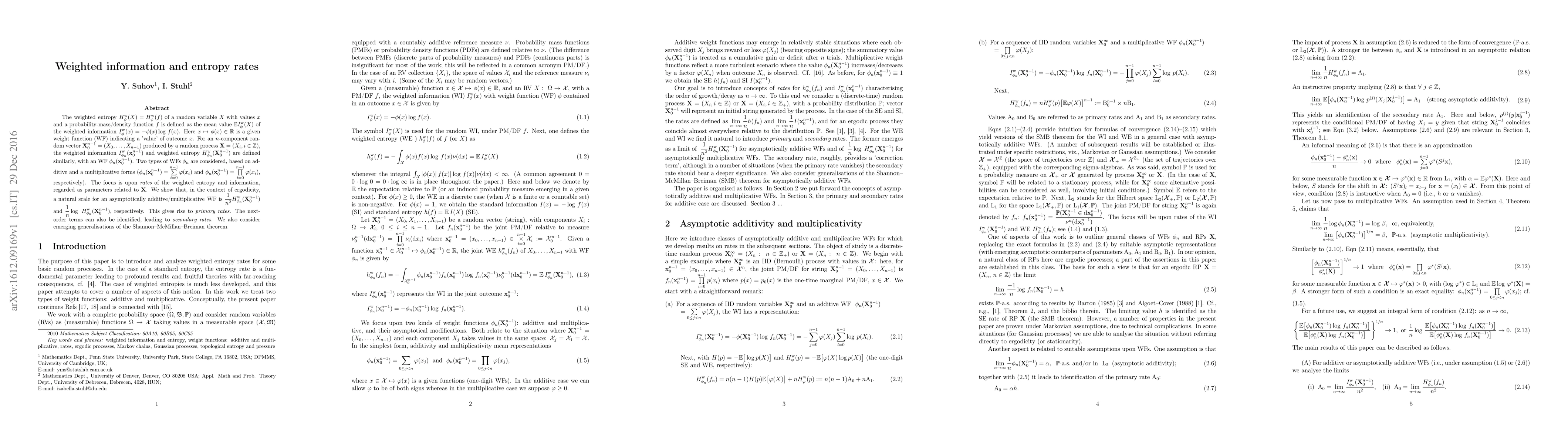 The weighted entropy $H^{\rm w}_\phi (X)=H^{\rm w}_\phi (f)$ of a random variable $X$ with values $x$ and a probability-mass/density function $f$ is defined as the mean value ${\mathbb E} I^{\rm w}_\phi(X)$ of the weighted information $I^{\rm w}_\phi (x)=-\phi (x)\log\,f(x)$. Here $x\mapsto\phi (x)\in{\mathbb R}$ is a given weight function (WF) indicating a 'value' of outcome $x$. For an $n$-component random vector ${\mathbf{X}}_0^{n-1}=(X_0,\ldots ,X_{n-1})$ produced by a random process ${\mathbf{X}}=(X_i,i\in{\mathbb Z})$, the weighted information $I^{\rm w}_{\phi_n}({\mathbf x}_0^{n-1})$ and weighted entropy $H^{\rm w}_{\phi_n}({\mathbf{X}}_0^{n-1})$ are defined similarly, with an WF $\phi_n({\mathbf x}_0^{n-1})$. Two types of WFs $\phi_n$ are considered, based on additive and a multiplicative forms ($\phi_n({\mathbf x}_0^{n-1})=\sum\limits_{i=0}^{n-1}{\varphi} (x_i)$ and $\phi_n({\mathbf x}_0^{n-1})=\prod\limits_{i=0}^{n-1}{\varphi} (x_i)$, respectively). The focus is upon ${\it rates}$ of the weighted entropy and information, regarded as parameters related to ${\mathbf{X}}$. We show that, in the context of ergodicity, a natural scale for an asymptotically additive/multiplicative WF is $\frac{1}{n^2}H^{\rm w}_{\phi_n}({\mathbf{X}}_0^{n-1})$ and $\frac{1}{n}\log\;H^{\rm w}_{\phi_n}({\mathbf{X}}_0^{n-1})$, respectively. This gives rise to ${\it primary}$ ${\it rates}$. The next-order terms can also be identified, leading to ${\it secondary}$ ${\it rates}$. We also consider emerging generalisations of the Shannon-McMillan-Breiman theorem.