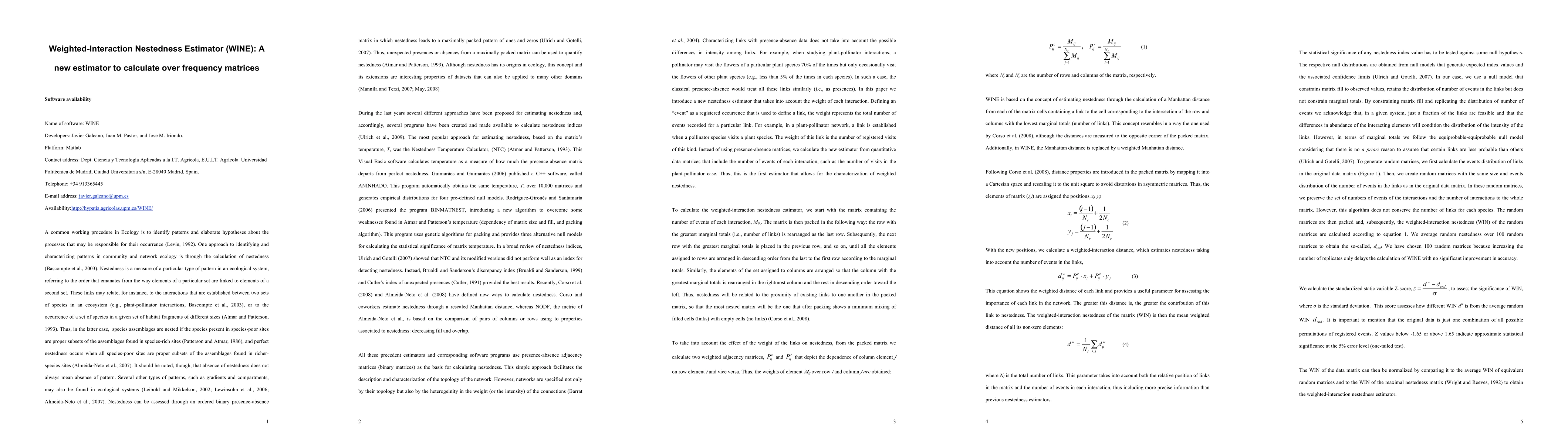 **Summary:** The paper introduces WINE, a Matlab-based graphical interface for calculating a new weighted nestedness estimator. It enables users to analyze frequency matrices, producing two graphics and three indices to assess nestedness in ecological networks.