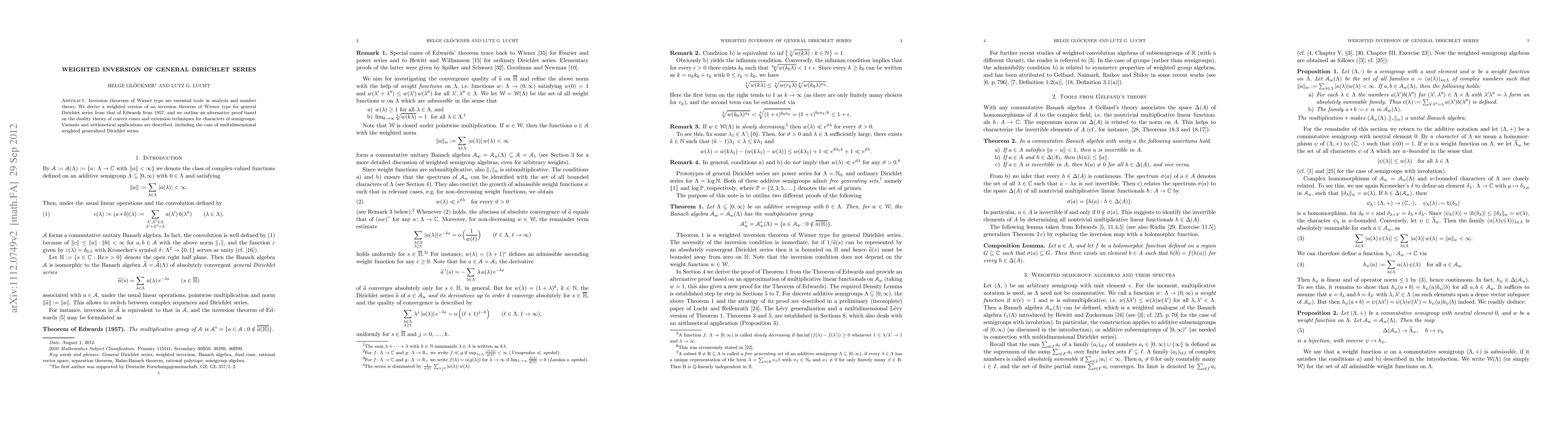 This paper derives a weighted inversion theorem for general Dirichlet series, extending Edwards' 1957 result, and provides an alternative proof using duality theory and semigroup character techniques. It also explores variants and arithmetic applications, including multidimensional cases.