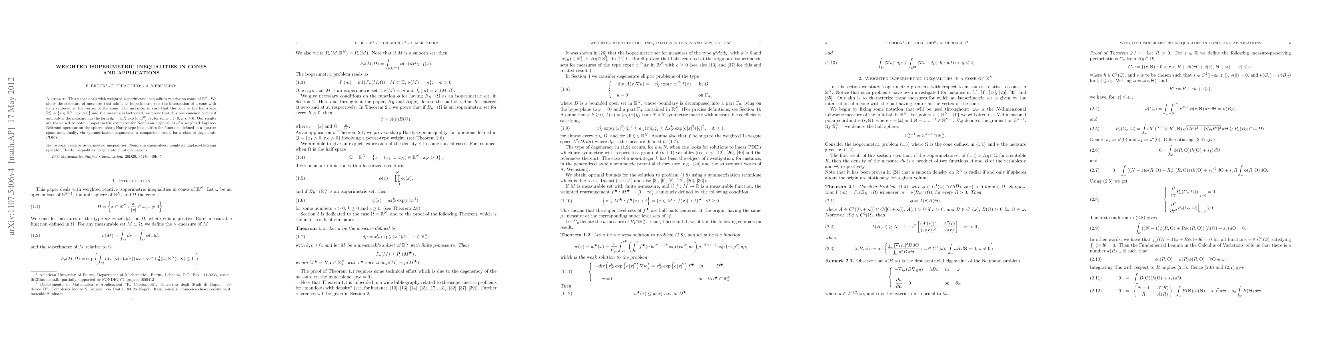 This paper deals with weighted isoperimetric inequalities relative to cones of $\mathbb{R}^{N}$. We study the structure of measures that admit as isoperimetric sets the intersection of a cone with balls centered at the vertex of the cone. For instance, in case that the cone is the half-space $\mathbb{R}_{+}^{N}={x \in \mathbb{R}^{N} : x_{N}>0}$ and the measure is factorized, we prove that this phenomenon occurs if and only if the measure has the form $d\mu=ax_{N}^{k}\exp(c|x|^{2})dx $, for some $a>0$, $k,c\geq 0$. Our results are then used to obtain isoperimetric estimates for Neumann eigenvalues of a weighted Laplace-Beltrami operator on the sphere, sharp Hardy-type inequalities for functions defined in a quarter space and, finally, via symmetrization arguments, a comparison result for a class of degenerate PDE's.