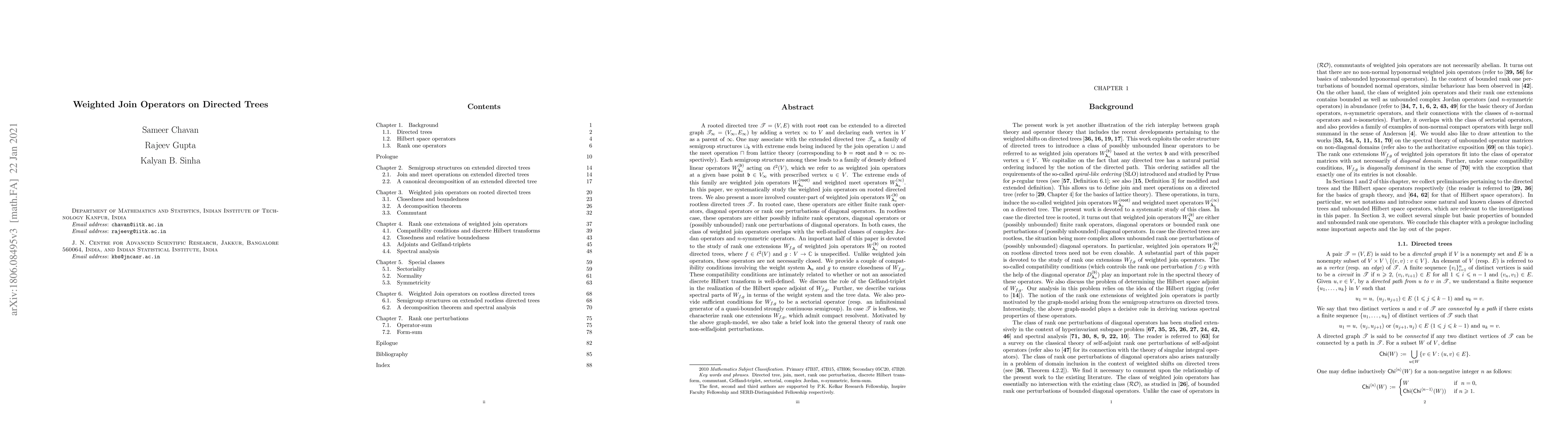 A rooted directed tree $\mathscr T=(V, E)$ with can be extended to a directed graph $\mathscr T_\infty=(V_\infty, E_\infty)$ by adding a vertex $\infty$ to $V$ and declaring each vertex in $V$ as a parent of $\infty.$ One may associate with the extended directed tree a family of semigroup structures $\sqcup_{b}$ with extreme ends being induced by the join operation $\sqcup$ and the meet operation $\sqcap$. Each semigroup structure among these leads to a family of densely defined linear operators $W^{b}_{\lambda_u}$ acting on $\ell^2(V),$ which we refer to as weighted join operators at a given base point $b \in V_{\infty}$ with prescribed vertex $u \in V$. The extreme ends of this family are weighted join operators $W^{\mathsf{root}}_{\lambda_u}$ and weighted meet operators $W^{\infty}_{\lambda_u}$. In this paper, we systematically study these operators. We also present a more involved counter-part of weighted join operators on rootless directed trees. In both cases, the class of weighted join operators overlaps with the well-studied classes of complex Jordan operators and $n$-symmetric operators. An important half of this paper is devoted to the study of rank one extensions $W_{f, g}$ of weighted join operators, where $f \in \ell^2(V)$ and $g : V \to \mathbb C$ is unspecified. Unlike weighted join operators, these operators are not necessarily closed. We provide a couple of compatibility conditions involving the weight system $\lambda_u$ and $g$ to ensure closedness of $W_{f, g}$. We discuss the role of the Gelfand-triplet in the realization of the Hilbert space adjoint of $W_{f, g}$. Further, we describe various spectral parts of $W_{f, g}$ in terms of the weight system and the tree data. We also provide sufficient conditions for $W_{f, g}$ to be a sectorial operator. In case $\mathscr T$ is leafless, we characterize rank one extensions $W_{f, g}$, which admit compact resolvent.